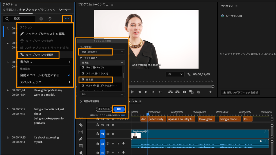 日本語で収録‧作成された動画をグローバルに展開する場合でも、海外言語の動画に日本語のキャプションを入れる場合でも、動画編集の手を止めて、文字起こしや翻訳の上りを待つ必要はもうありません。Premiere Proのこの一連のワークフローを実行することで、制作時間を劇的に減らすことができます。ぜひ試してみてください。