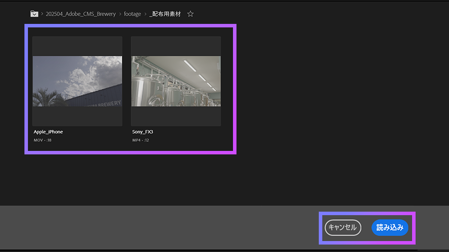 Premiere Proを起動し、左上の「新規プロジェクト」ボタンをクリックします。プロジェクト名と保存場所を設定した後、「作成」ボタンをクリックします。次に、ダウンロードしたサンプルファイルを選択し、「読み込み」ボタンをクリックします。シーケンスが作成され、サンプルファイルがタイムラインに配置されます。