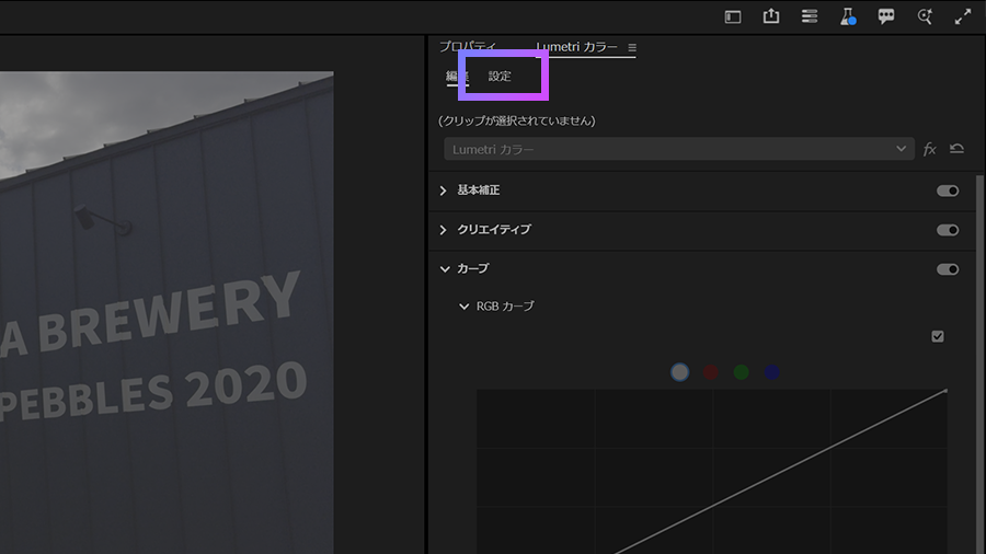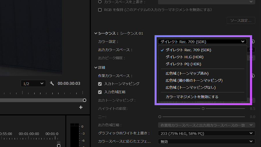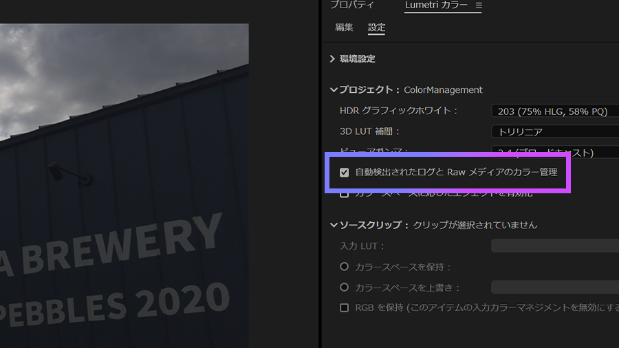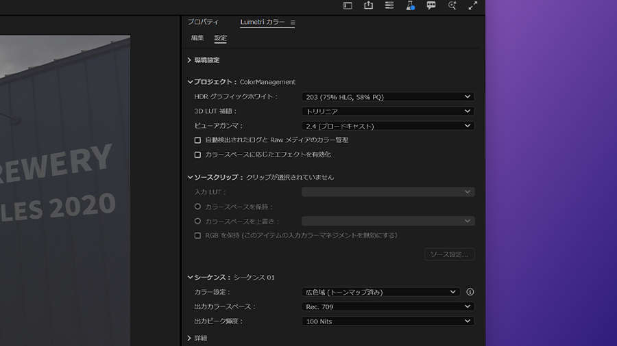 Lumetriカラーパネル内の「設定」をクリックすると、カラーマネジメントの設定が表示されます。