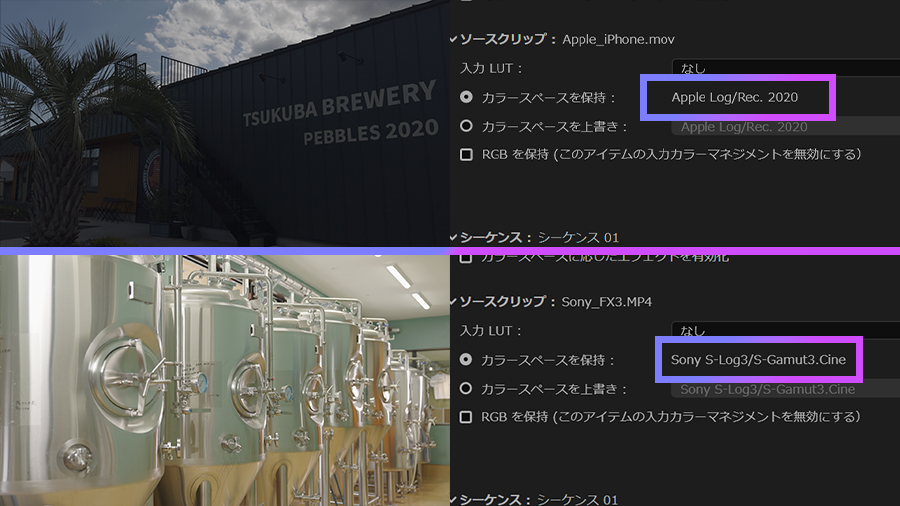 「プロジェクト」項目内にある「自動検出されたログとRawメディアのカラー管理」にチェックを入れると、各クリップのカラーが自動で変換されます。