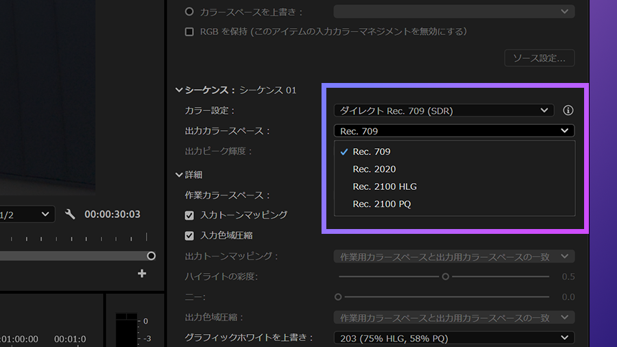 「出力カラースペース」では、出力するモニターに合わせて設定変更が可能です。一般的なモニターでは「Rec.709」を選び、HDRモニターをお持ちの方は、「Rec.2020」や「Rec.2100」など、モニターに最適な形式を選んでください。