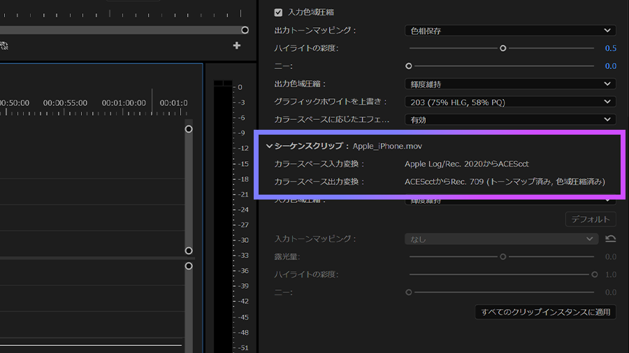 クリップを選択した状態で、「ソースクリップ」内の「カラースペースを保持」を確認すると、そのクリップの記録形式が自動で認識され、適切なカラースペースに変換されていることがわかります。もしカラースペースが自動で認識されない場合や、手動で変換したいときは、「カラースペースを上書き」から任意のカラースペースを選択できます。また、「RGBを保持」にチェックを入れることで、自動変換を無効にすることも可能です。