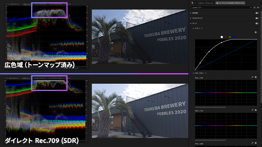 「カラー設定」で「広色域(トーンマップ済み)」を選択すると、クリップごとの色のばらつきが軽減されるだけでなく、カラー補正時に自動トーンマッピングが適用され、白飛びなどのクリッピングを防ぐことができます。実際に「Lumetriスコープ」パネルで確認すると、同じ補正内容でも「ダイレクト Rec.709(SDR)」では高輝度の雲のディテールがクリッピングされているのに対し、「広色域(トーンマップ済み)」ではそのディテールがしっかりと保持されていることがわかります。LOGやRAW素材のダイナミックレンジの広さを最大限に活用できるので、おすすめです。