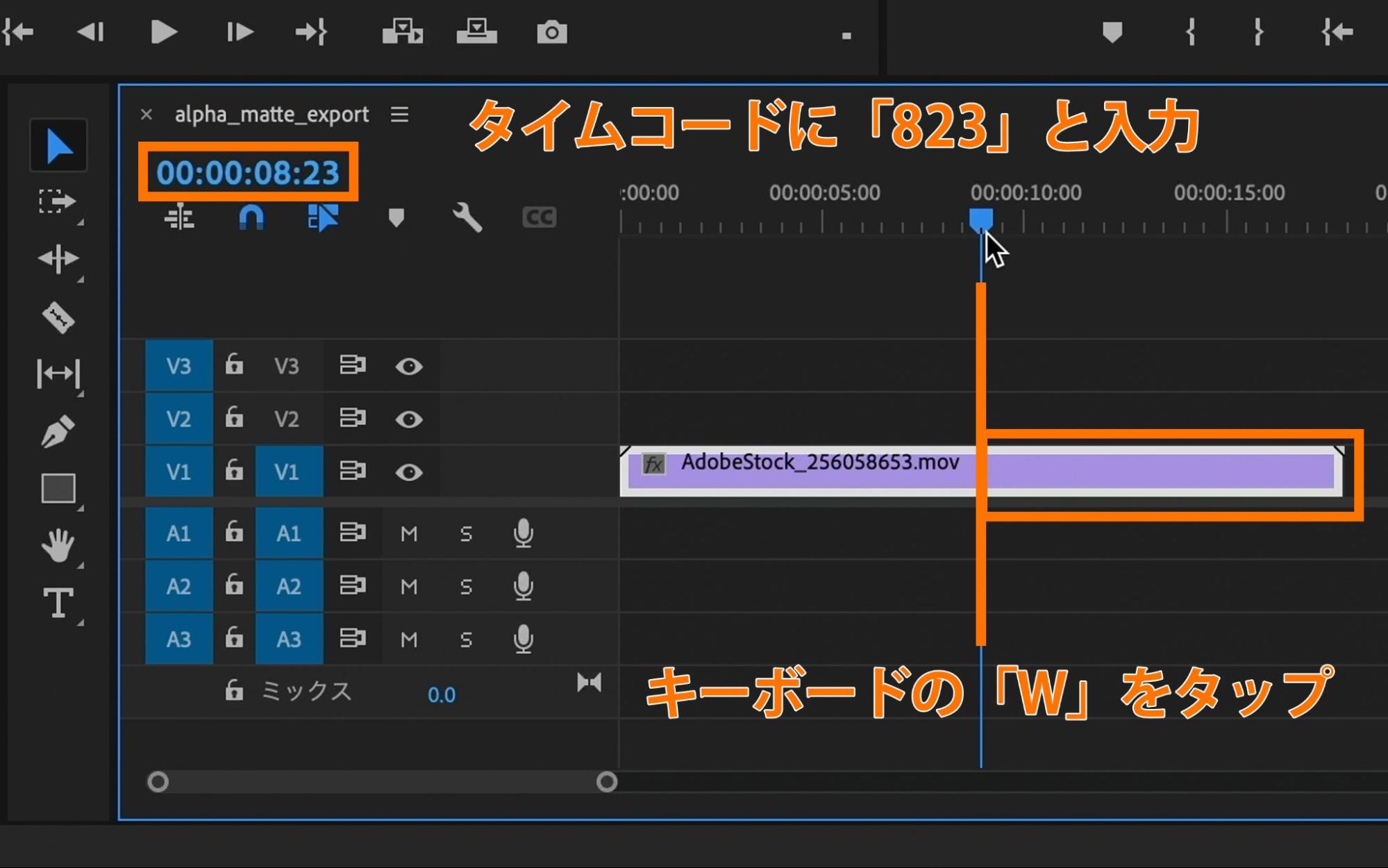 再生ヘッドが0:00:08:23に移動したことを確認してキーボードの「W」をタップします。