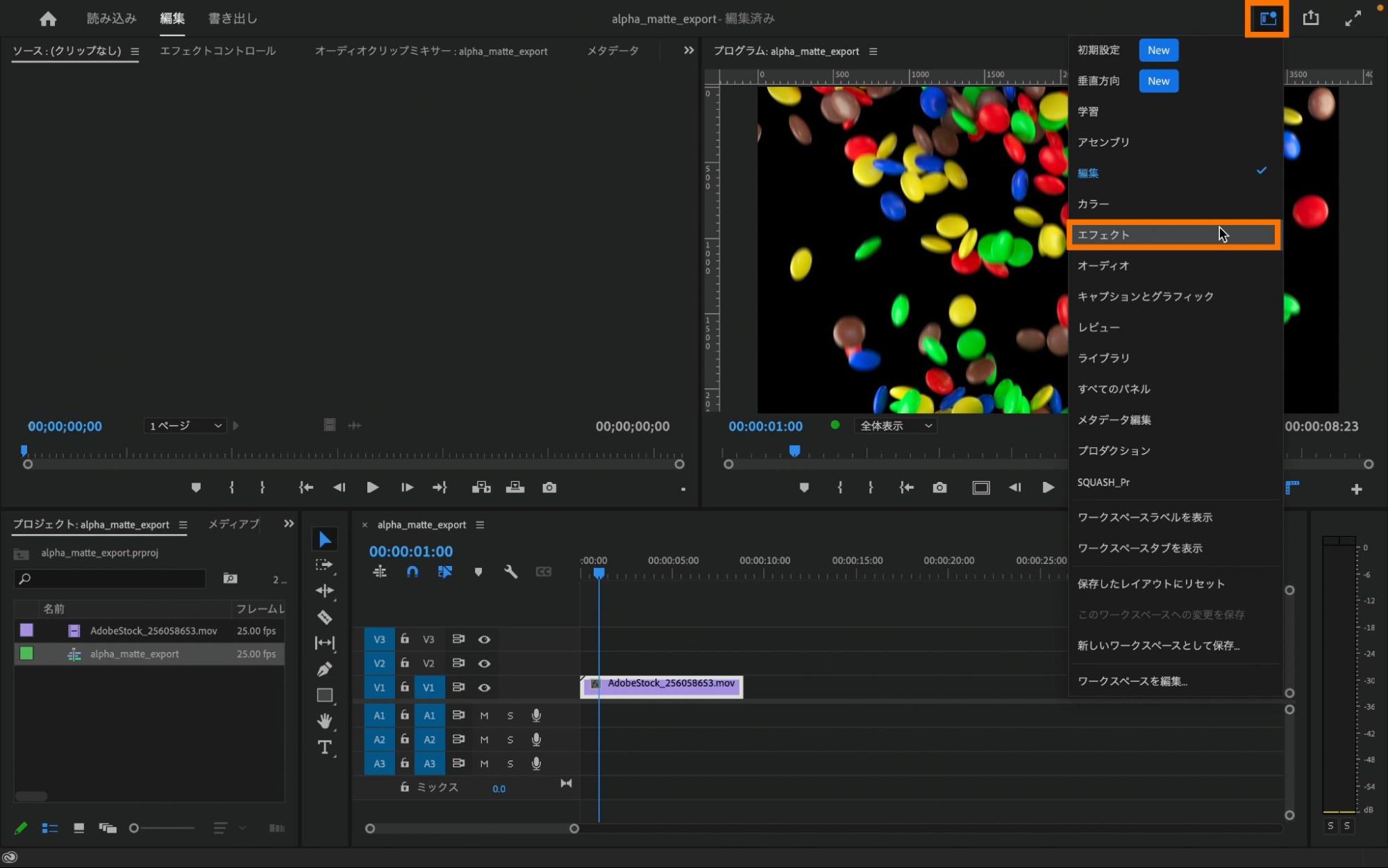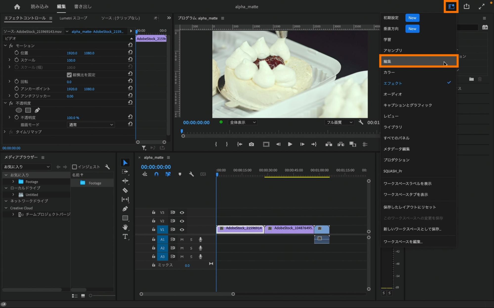 ここからはシーケンス上のみでの編集なので、画面右上にある「ワークスペース」を選択してワークスペースを「編集」に切り替えます。