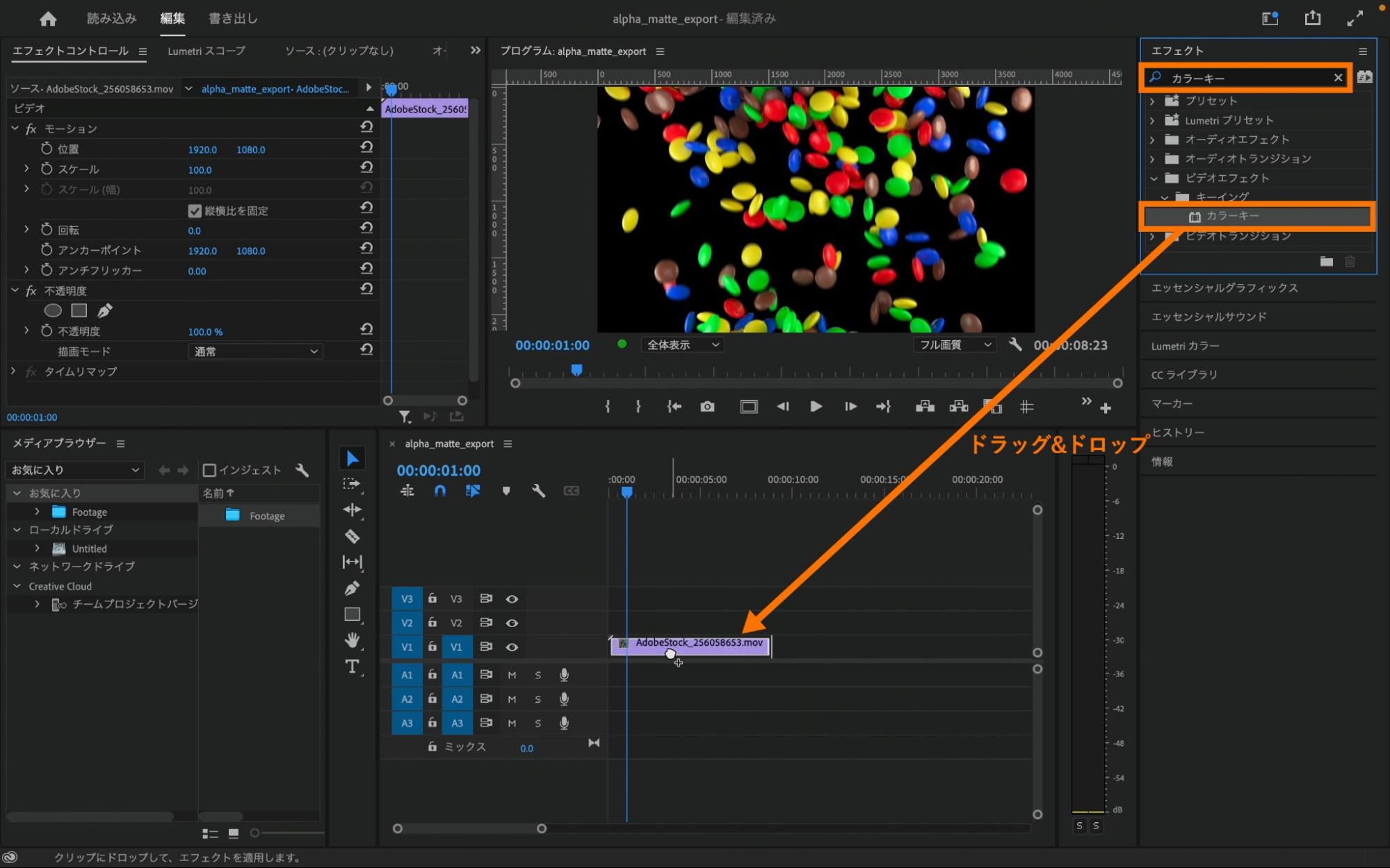 「カラーキー」をタイムライン上の編集素材にドラッグ&ドロップで適用します。