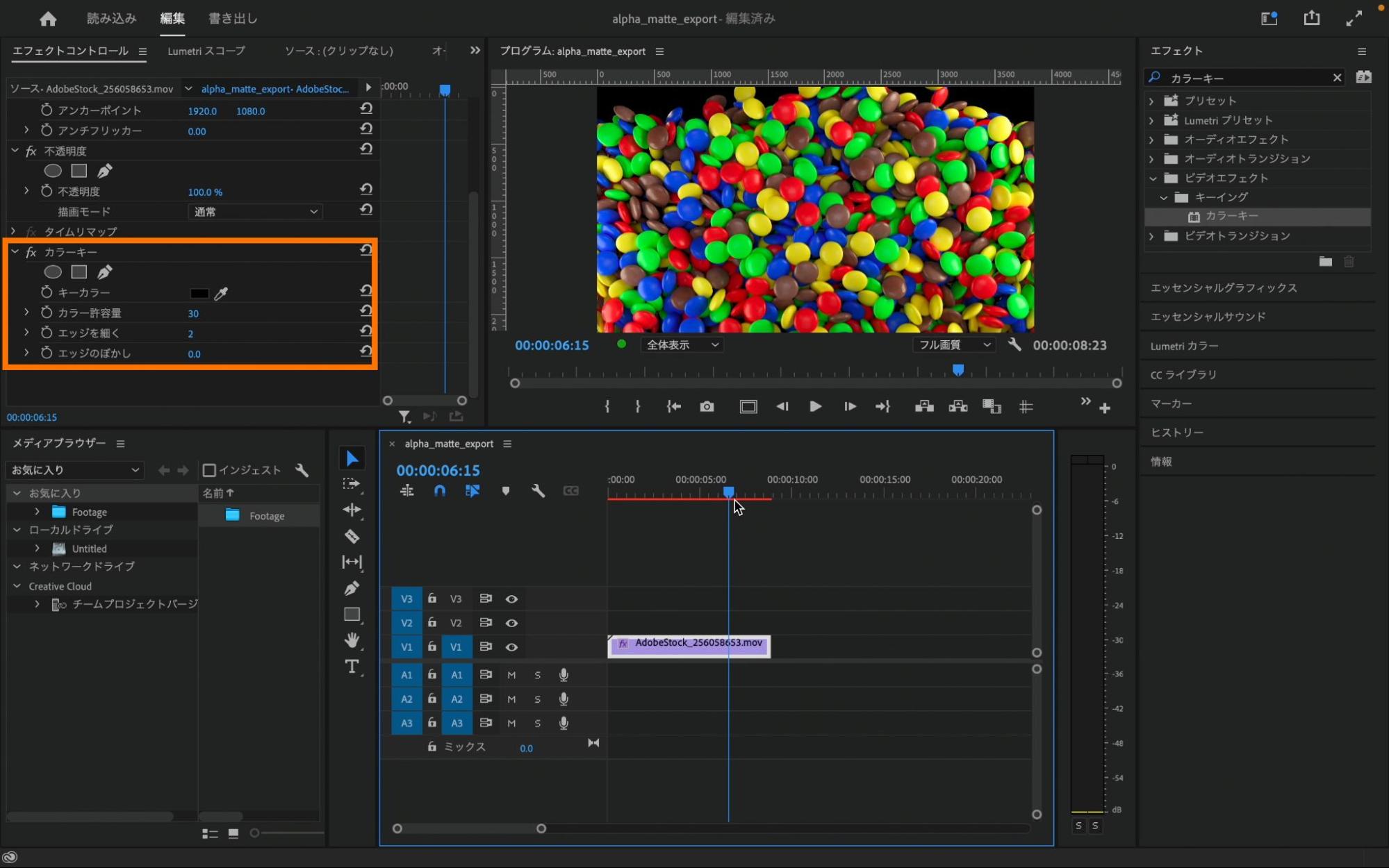この際、AdobeStock_215969143 → AdobeStock_104876495 → 先程書き出したアルファチャンネル付きの素材(alpha_matte_export.mov)の順にチェックを入れると以下の作業がスムーズに行えます。