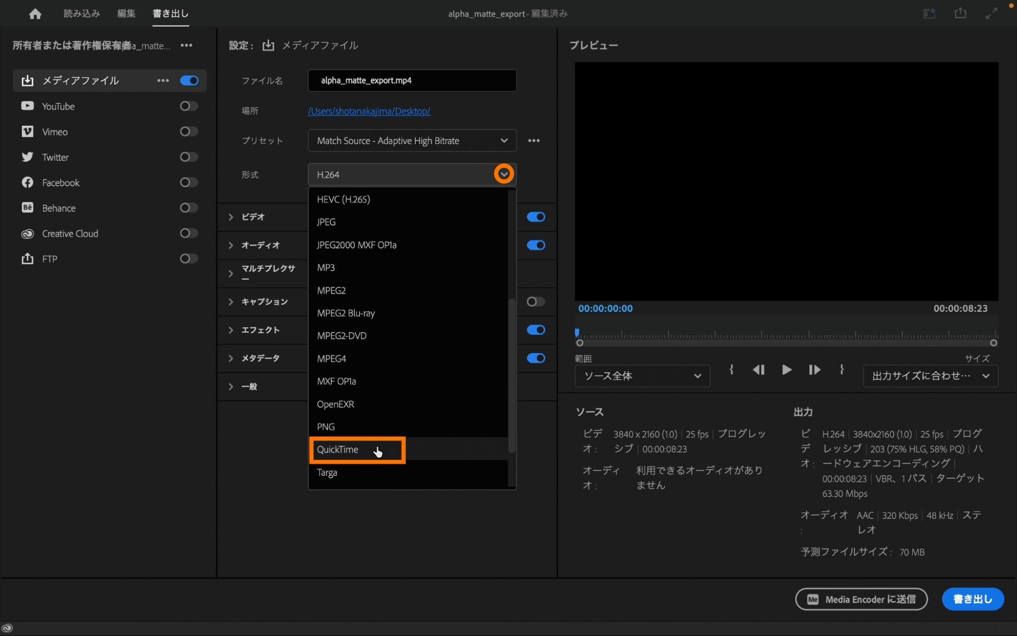 書き出し画面に切り替わったら「設定:メディアファイル」の中にある「形式」横にあるVマークを開いてプルダウンの中から「QuickTime」を選択します。