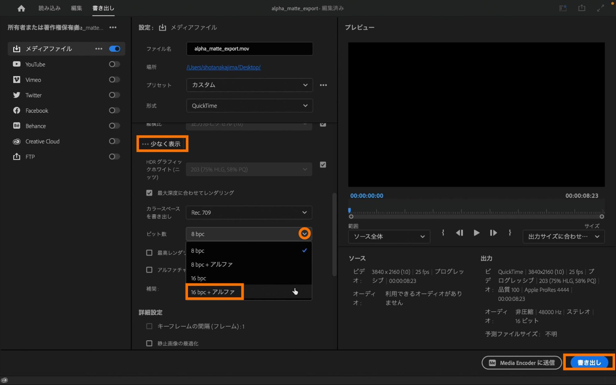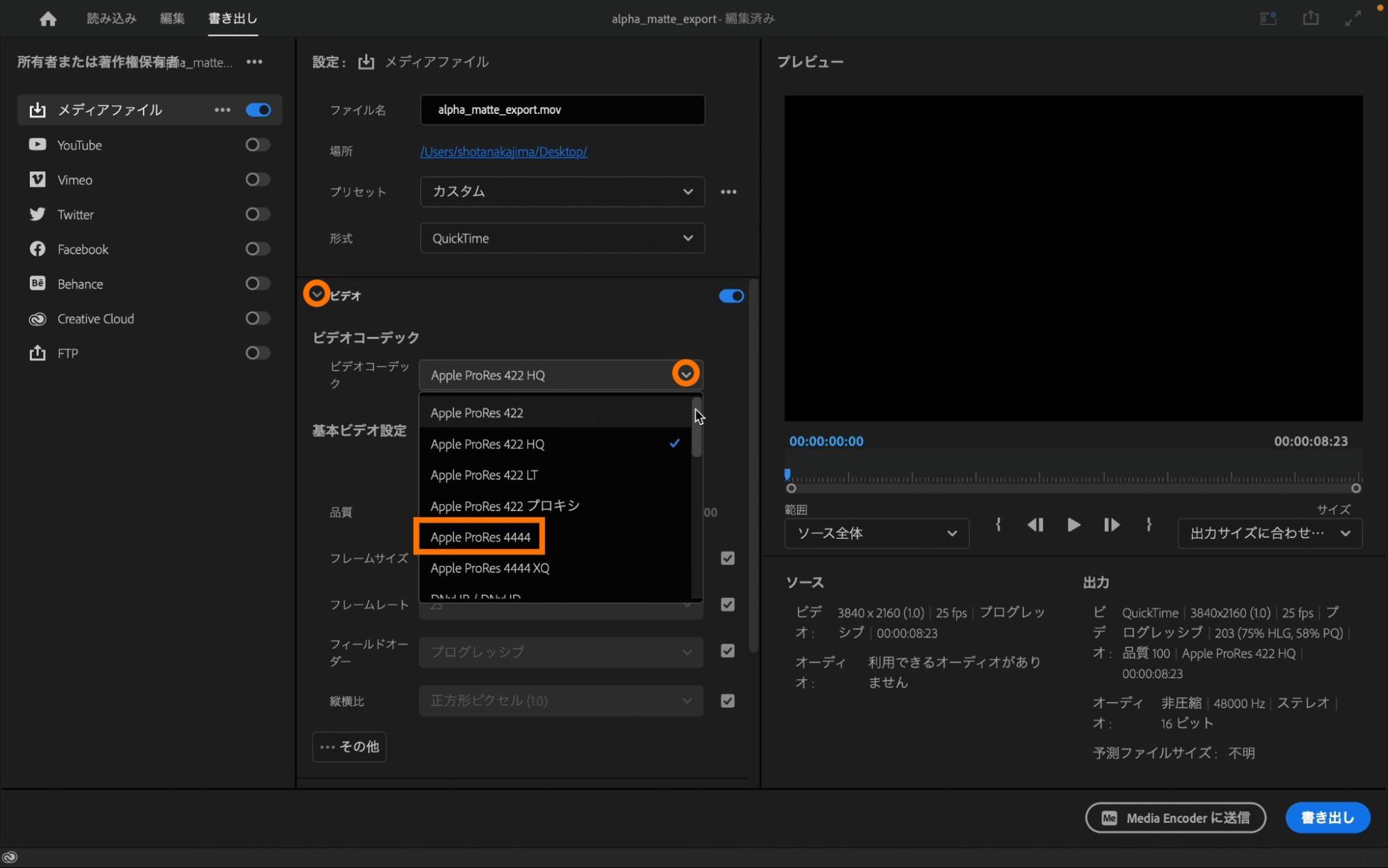 更に「ビデオ」の横にある>マークを開いて「ビデオコーデック」のプルダウンの中から「AppleProRes4444」を選択します。