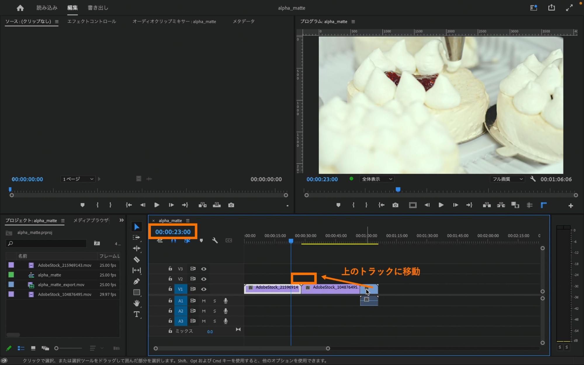 タイムラインパネル上の左上タイムコードに2300と入力して再生ヘッドを0:00:23:00に移動させます。タイムライン上の一番後ろに配置されているアルファ素材(alpha_matte_export.mov)をタイムライン上の一段上のレイヤー(V2のトラック)の0:00:23:00部分に移動させます。