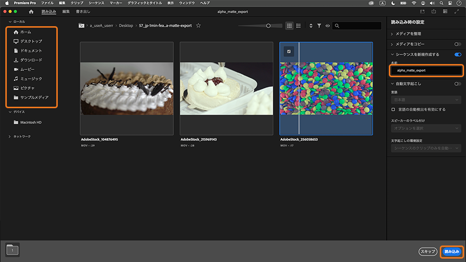 Premiere Proを起動してプロジェクトを新規作成します。プロジェクト名を「alpha_matte_export」に設定し、「ローカル」の欄で事前にダウンロードした素材の場所を選択して「AdobeStock_256058653」にチェックを入れます。シーケンス名も「alpha_matte_export」に設定して右下の「読み込み」を選択します。