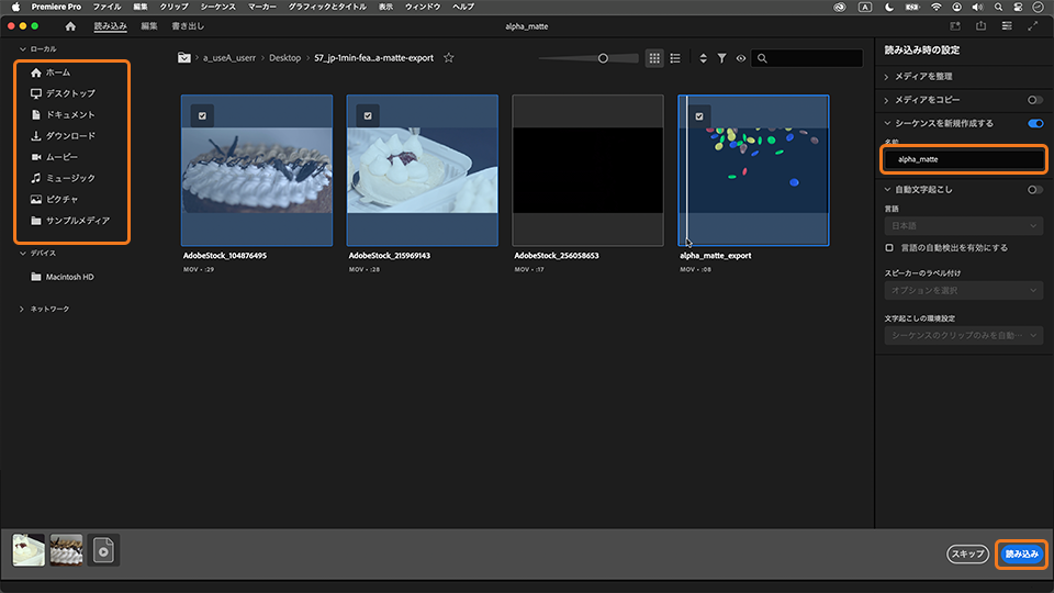 使用する素材にチェックを入れ終わったらシーケンス名を設定し、右下の「読み込み」を選択します。