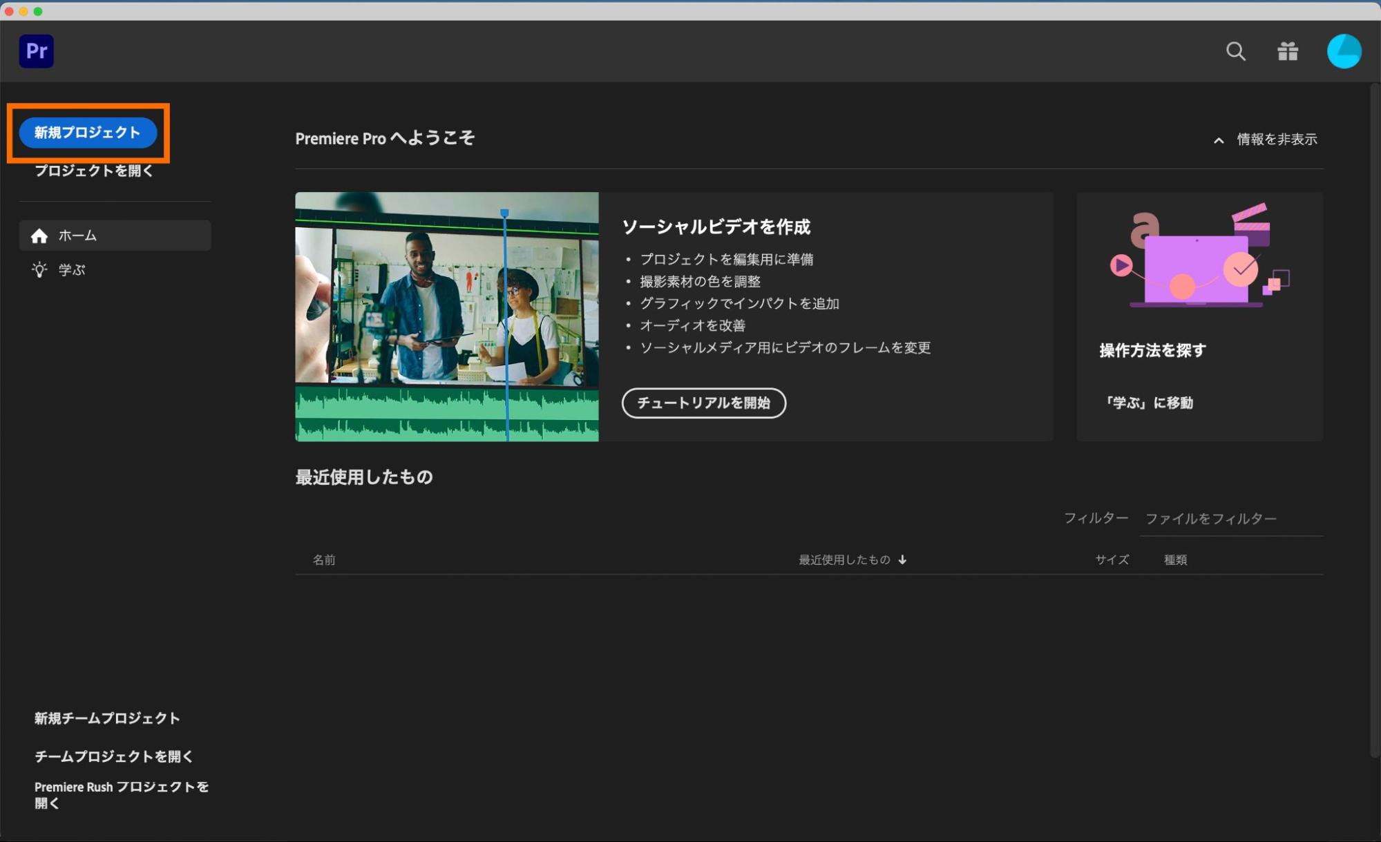 Premiere Proを起動してプロジェクトの新規作成画面を表示して、「新規プロジェクト」を選択します。