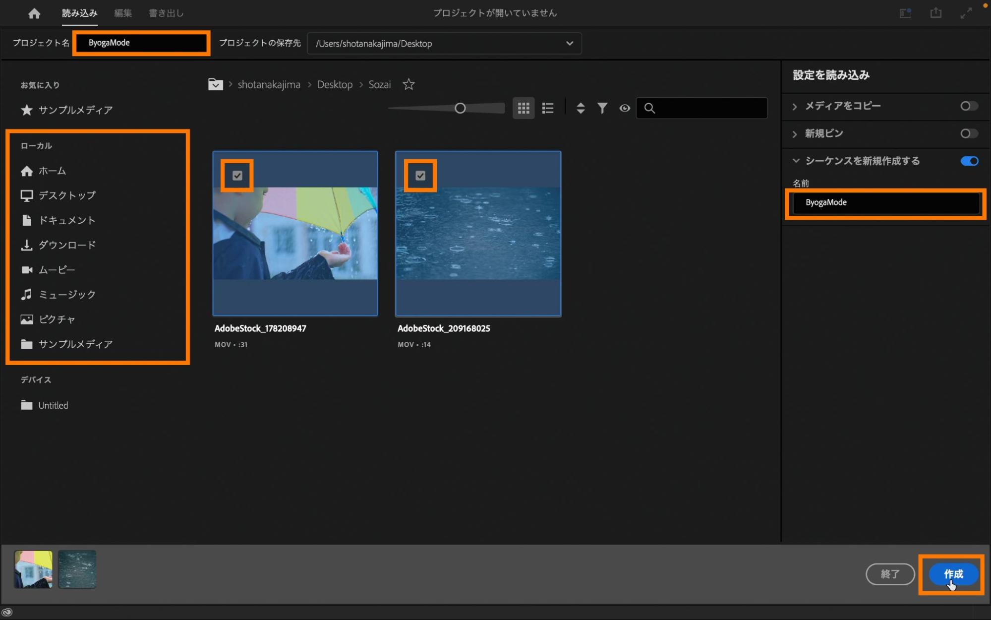 「読み込み」タブが表示されたら、シーケンス名を「ByogaMode」と設定し、「ローカル」の欄から事前にダウンロードした素材を選んでチェックボックスにチェックを入れて読み込みを開始します。