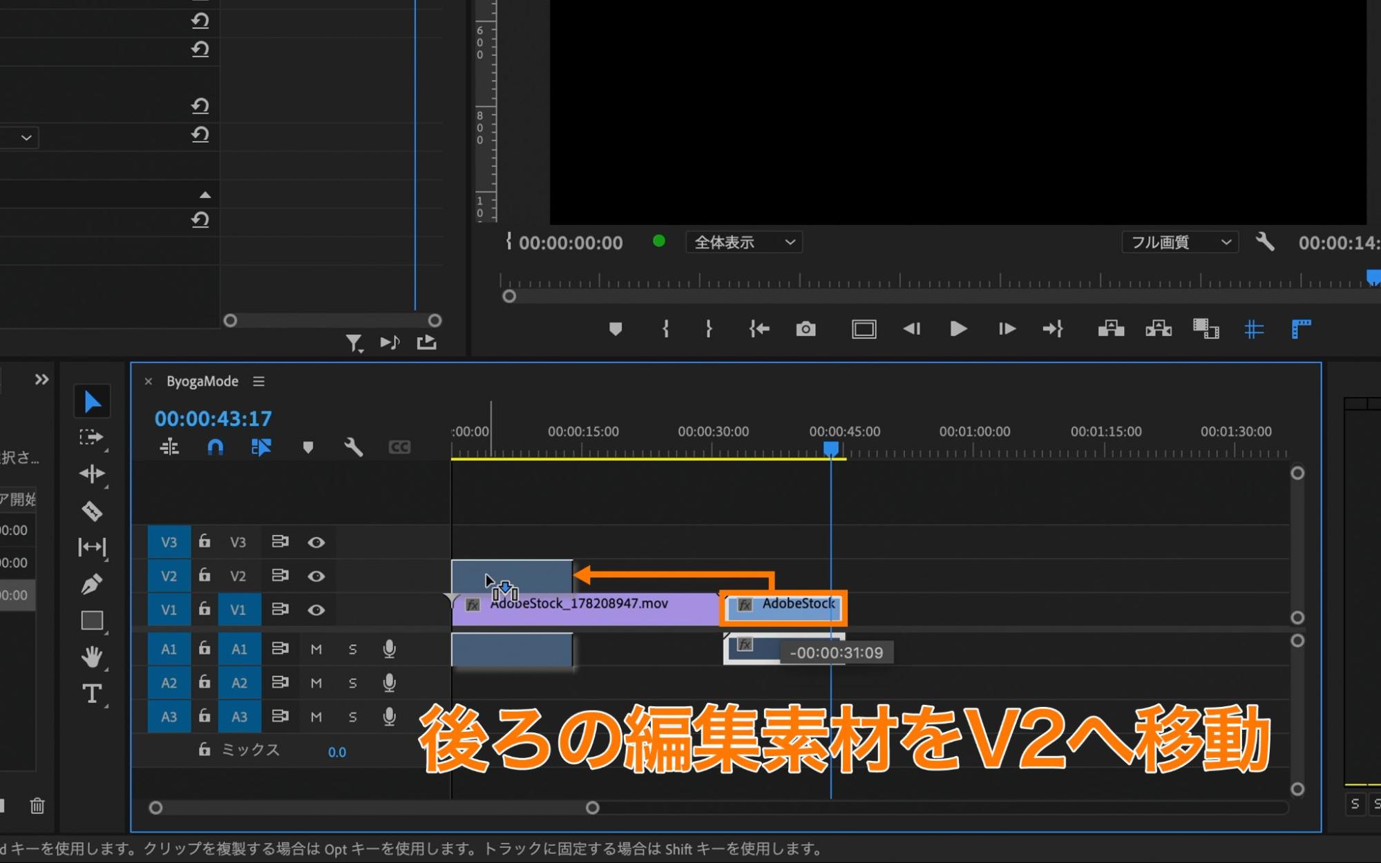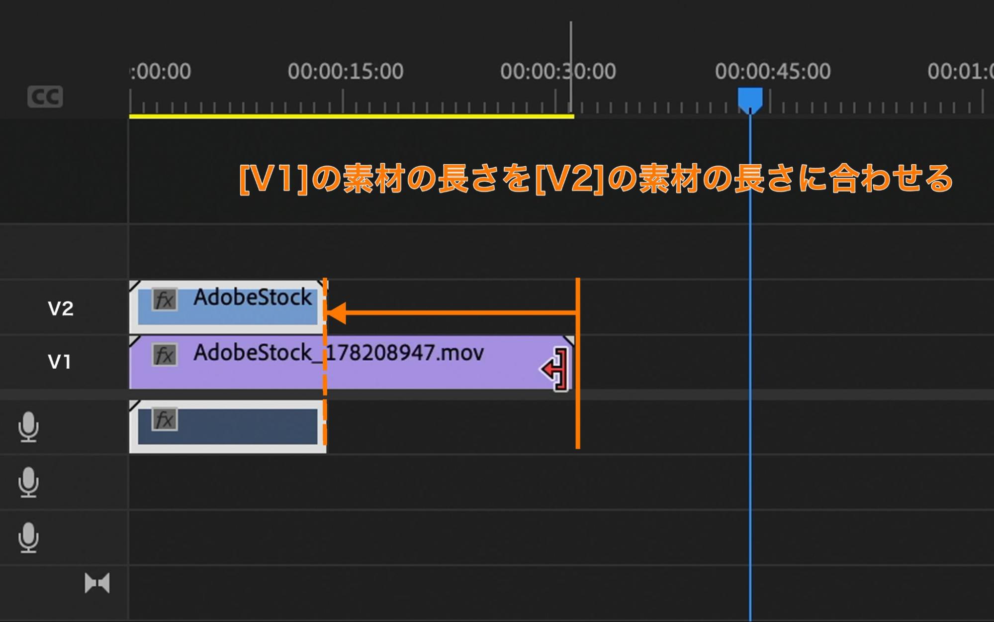 タイムラインパネル上に編集素材(AdobeStock_178208947とAdobeStock_209168025)が配置されていることを確認して、AdobeStock_209168025の素材をAdobeStock_178208947の上の[V2]に移動させます。移動後に、[V1]の素材の方が長いので、[V1]の映像末尾にカーソルを合わせて[V1]と[V2]の素材の長さを揃えておきます。