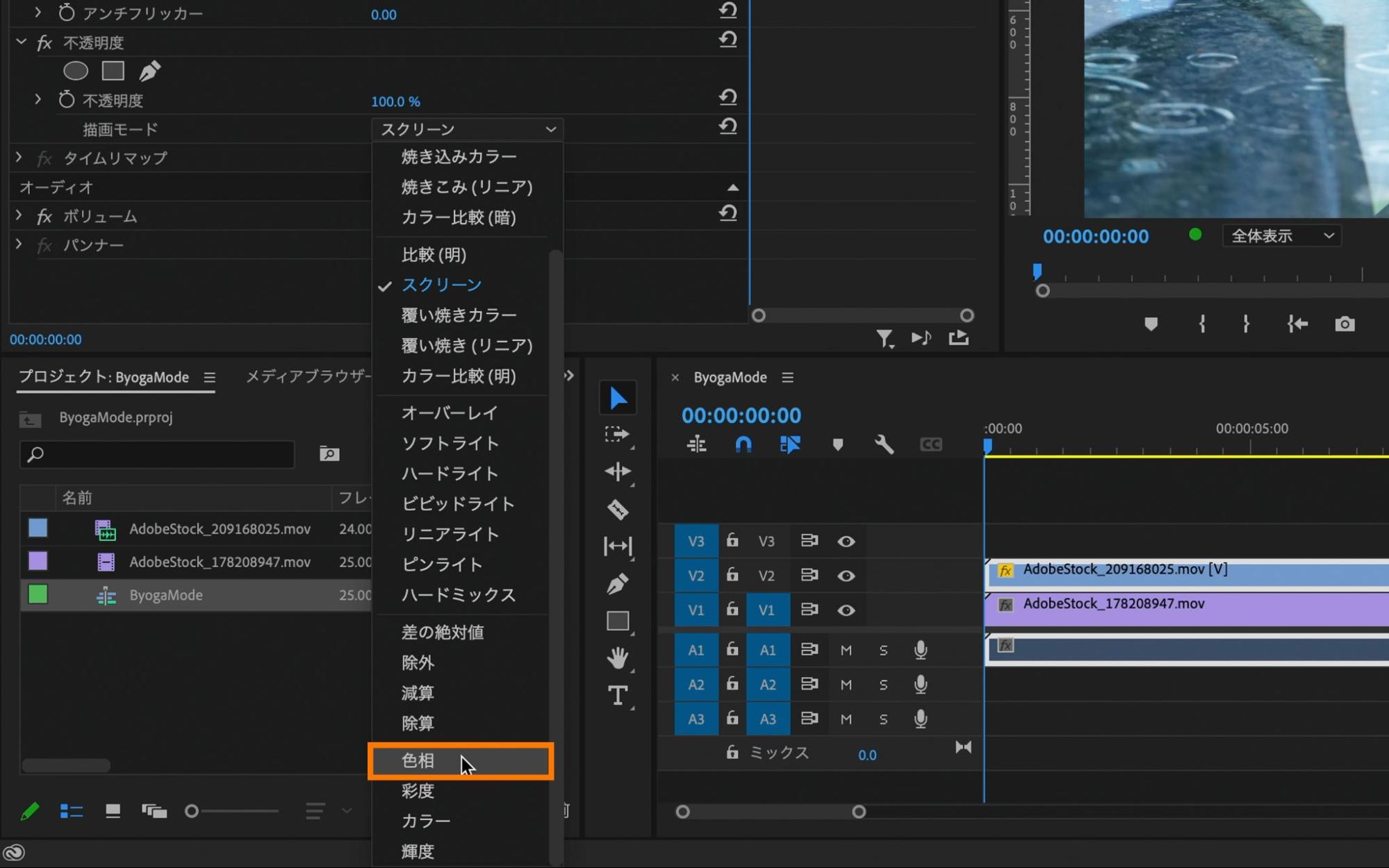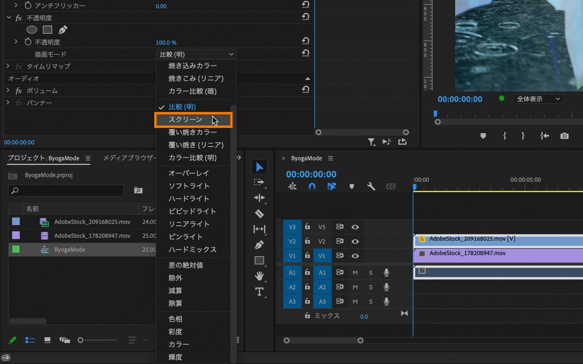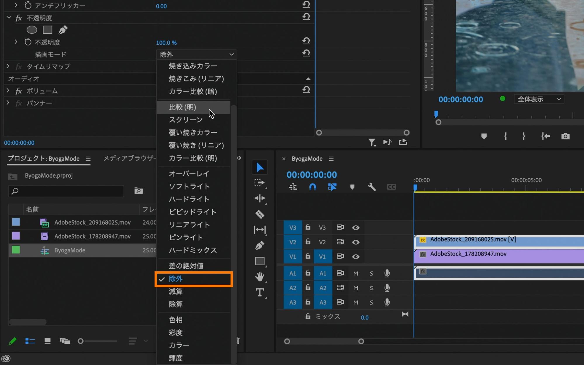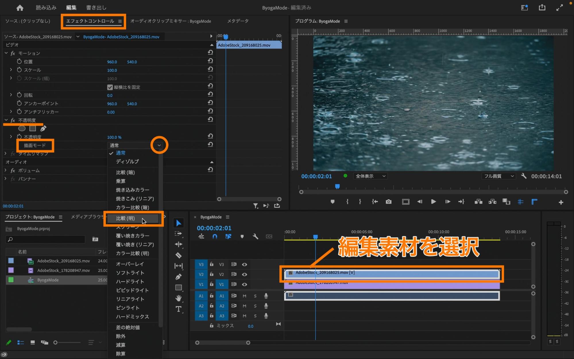 [V2]へ移動させた編集素材を選択した状態で、エフェクトコントロールパネル内の「不透明度」→「描画モード」の横にあるプルダウンの中から「比較(明)」を適用します。