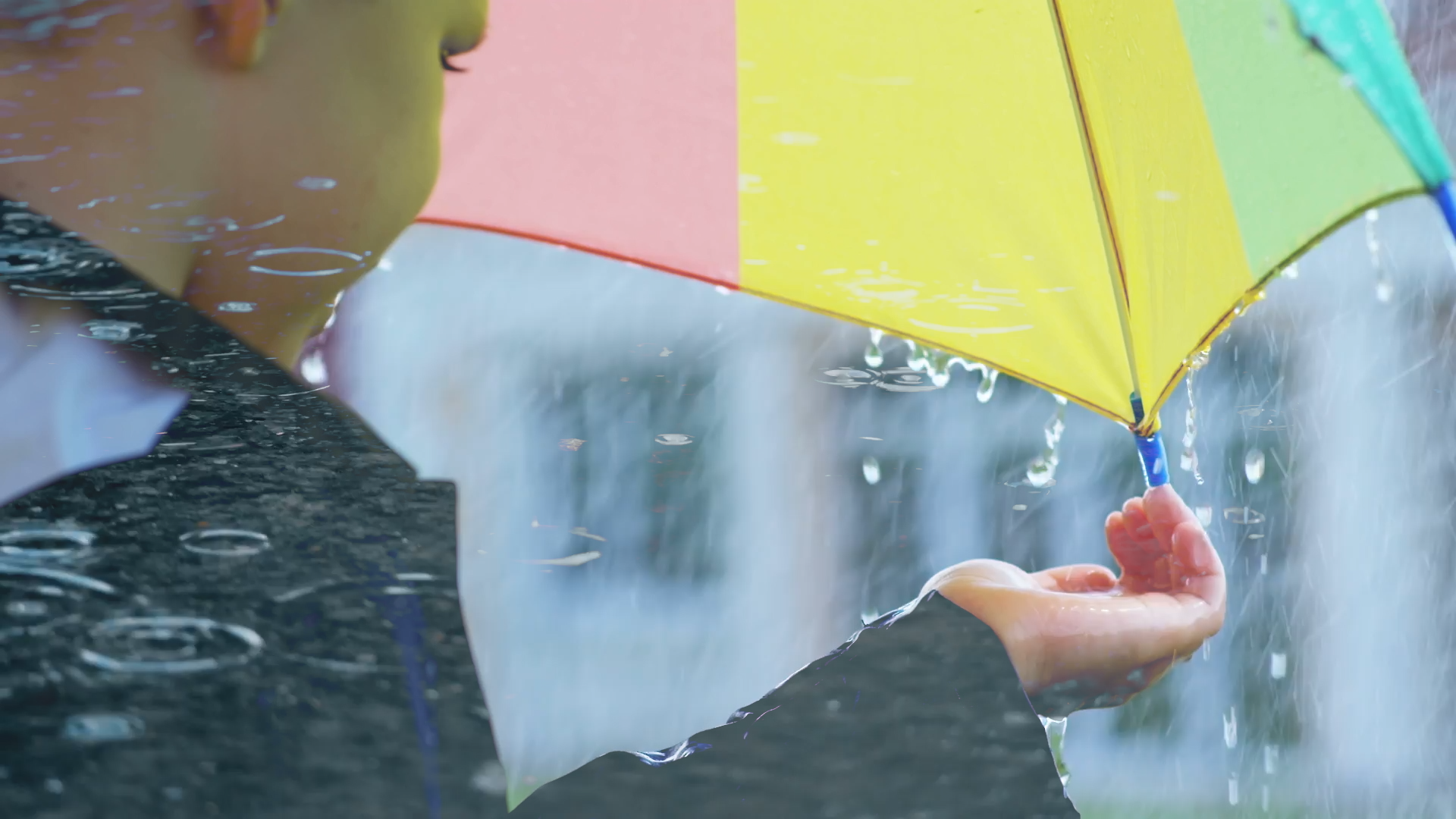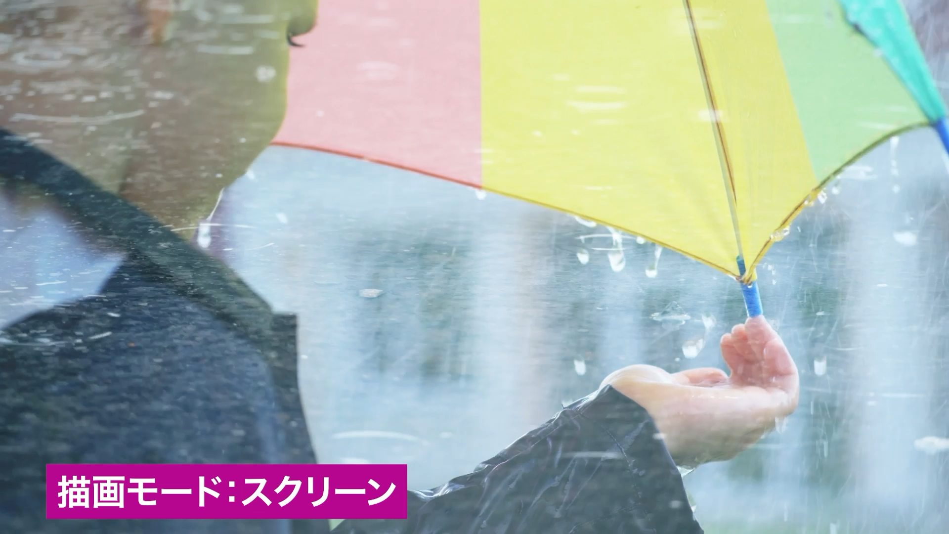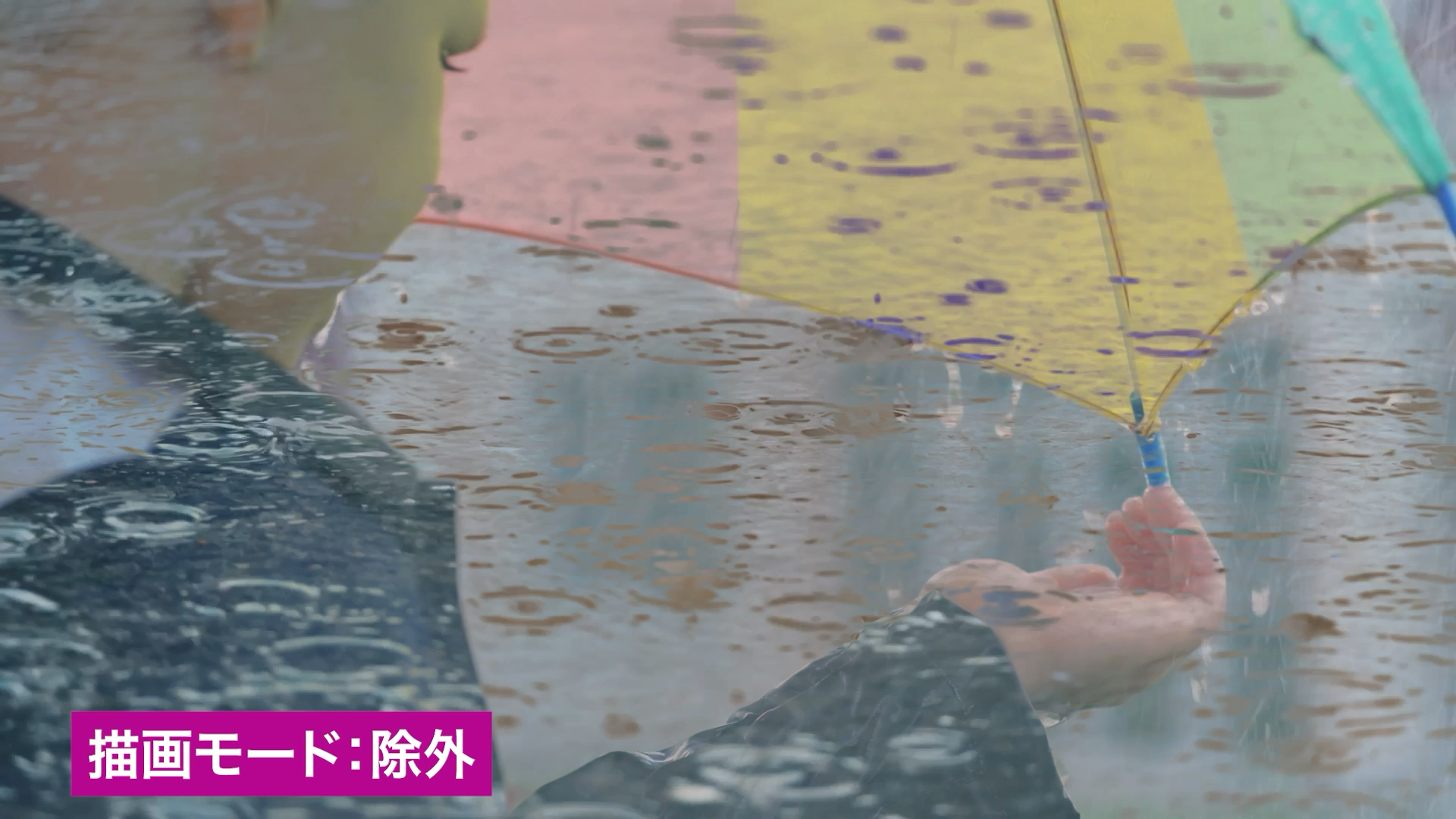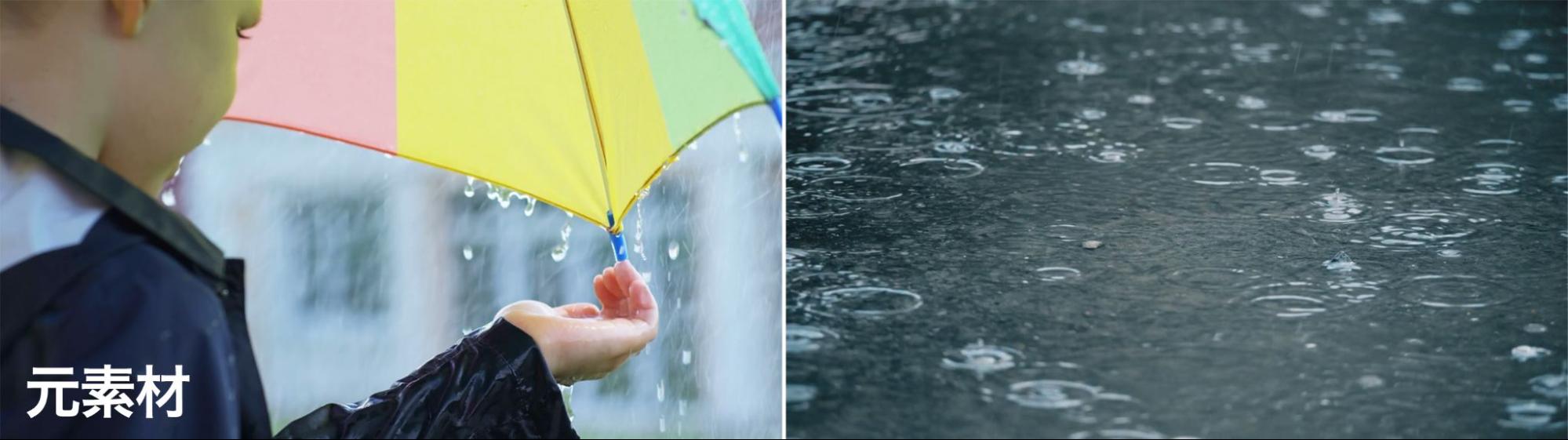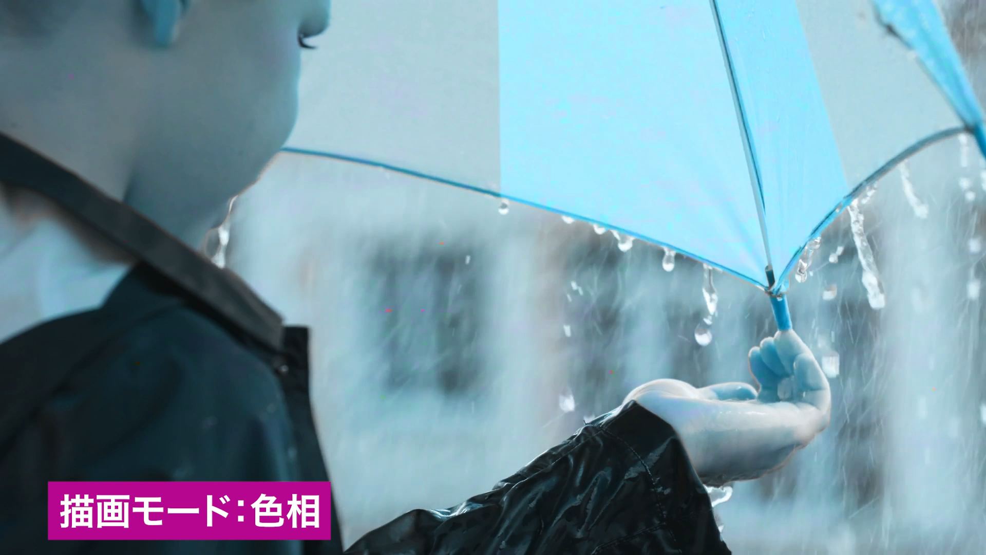 描画モード「比較(明)」は、各チャンネル内のカラー情報に基づき、基本色または合成色のいずれか明るい方を結果色として選択します。合成色よりも暗いピクセルが置き換えられ、合成色よりも明るいピクセルは変更されません。今回の素材では、レインコートのくらい部分に印象的に雨粒の素材が合成されています。