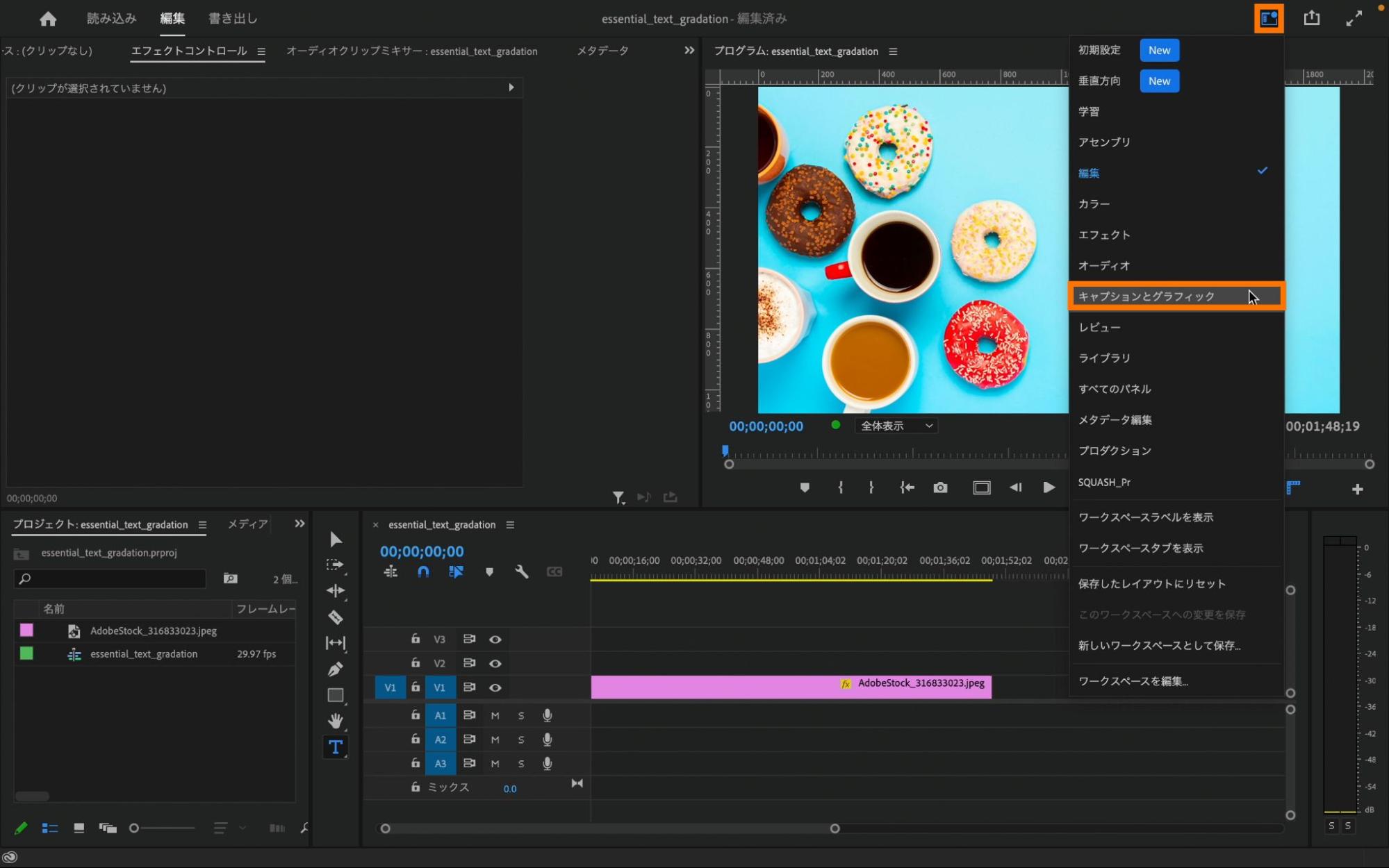 今回はグラフィックの編集なので、画面右上にある「ワークスペース」を選択してワークスペースの表示を「キャプションとグラフィック」に切り替えます。