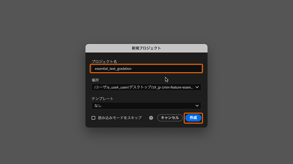 Premiere Proを起動してプロジェクトの新規作成画面が表示されたら、プロジェクト名を「essential_text_gradation」に設定し、「作成」をクリックします。