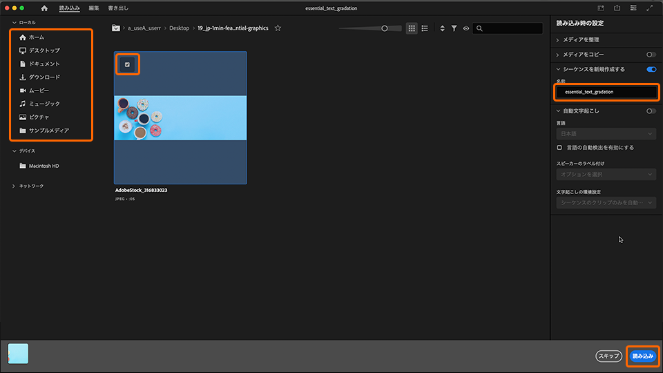 「ローカル」の欄で場所を選択し、事前にダウンロードした素材にチェックを入れます。シーケンス名も「essential_text_gradation」に設定して右下の「読み込み」を選択します。