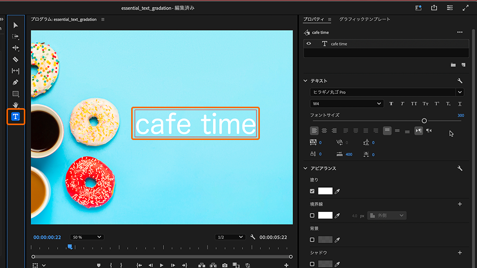 ツールパネルから「横書き文字ツール」を選択して、プログラムパネル上でテキストを入れたい部分を選択して文字を入力します。今回は「cafe time」と入力します。