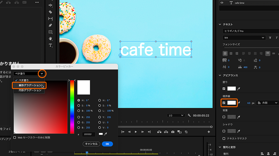 ポップアップで出てきた「カラーピッカー」の中から左上部分の「ベタ塗り」の横のVマークを開きプルダウンの中から「線形グラデーション」を選択します。