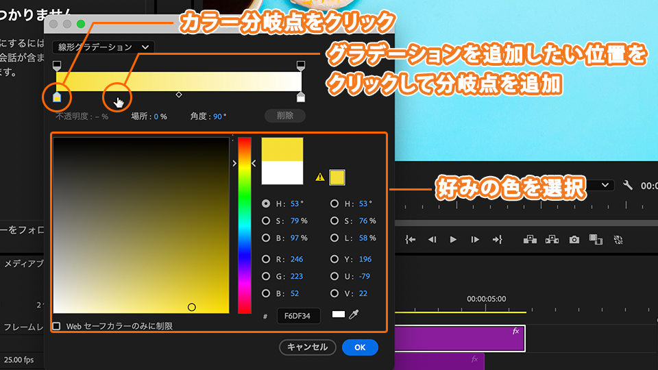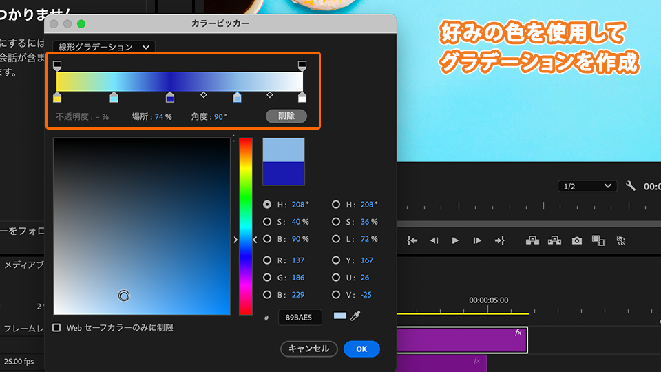カラーピッカー内のグラデーションバーにある「カラー分岐点」を選択して色を調整することでグラデーションの色味を変更をすることができます。