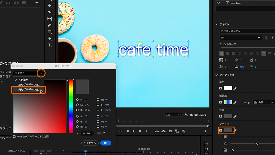 境界線と同様に、「シャドウ」とチェックボックスの間にある色指定の部分をクリックして「カラーピッカー」を表示させます。「ベタ塗り」横のVマークを開きプルダウンの中から「円形グラデーション」を選択します。