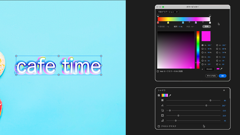 プロパティパネルの中にある各項目を調整する事でテキストをデザインすることができます。今回は境界線とシャドウにグラデーションをつけていきます。