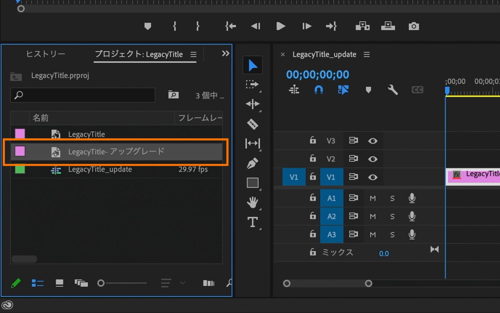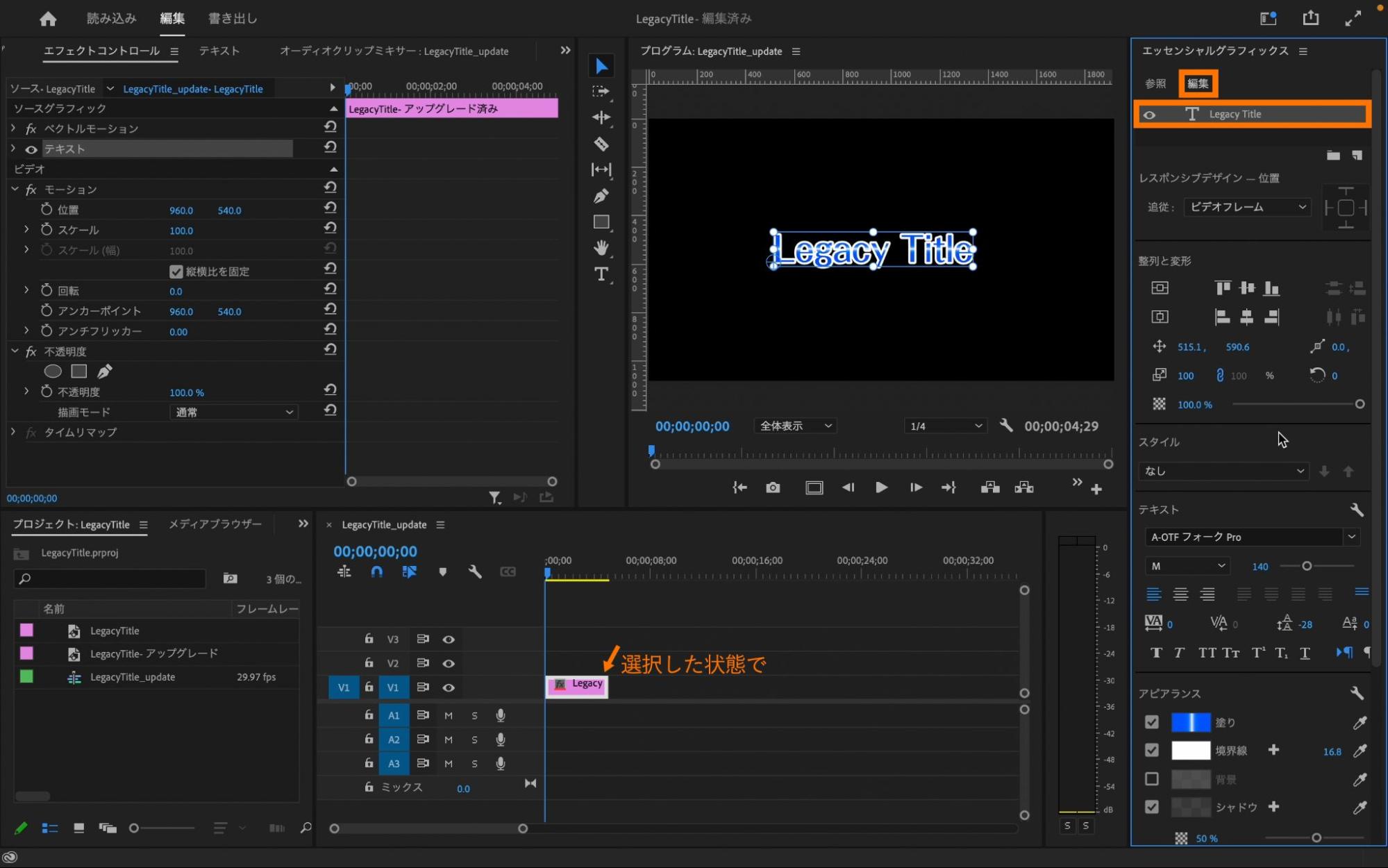 タイムライン上のアップグレードしたタイトルが選択されている状態で「編集」タブの下にある「LegacyTitle」を選択します。