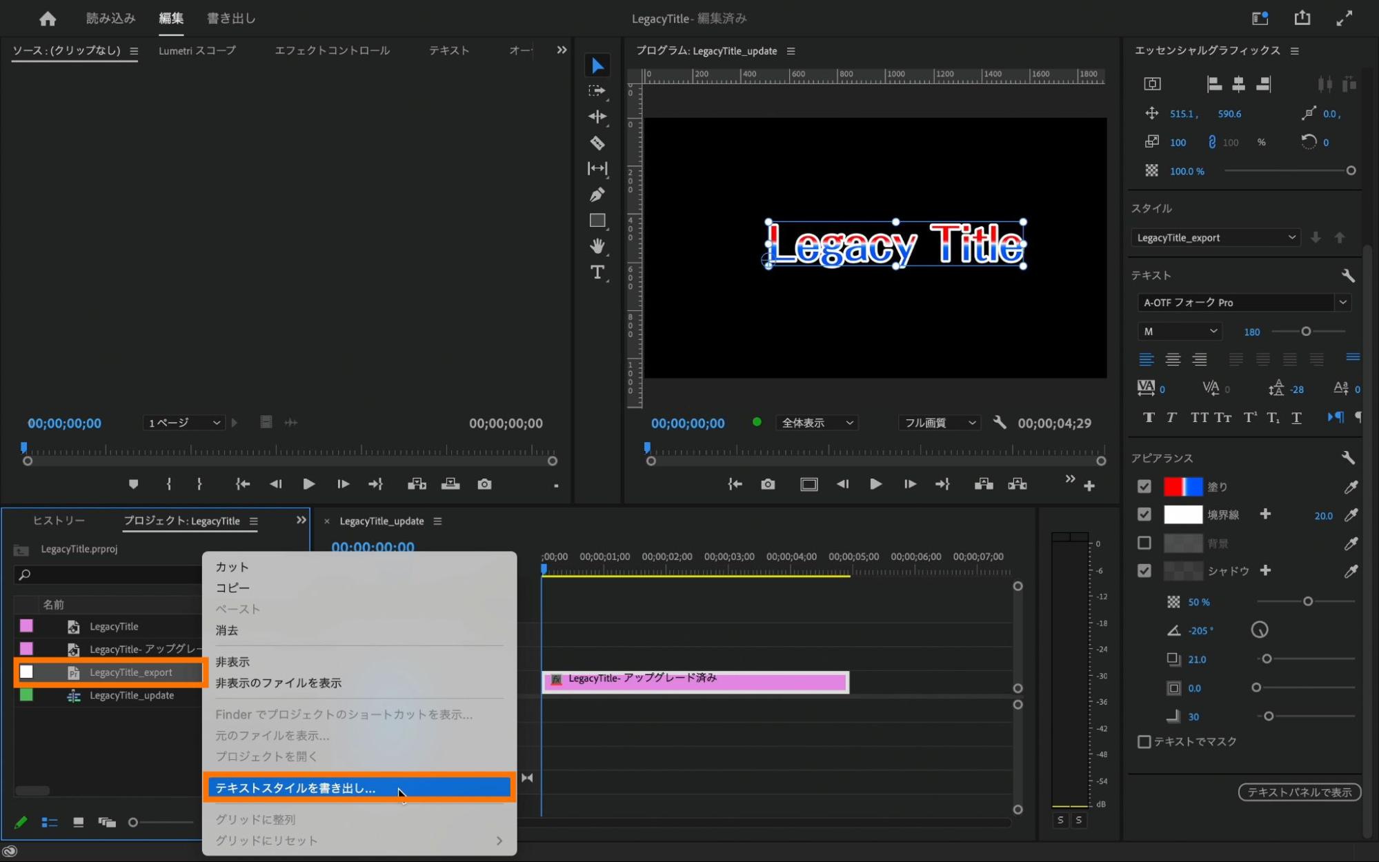 プロジェクトパネル上に先程作成した「LegacyTitle_export」があるので、右クリックから「テキストスタイルを書き出し…」を選択します。任意の場所を指定し、プリセットを保存することでプリセットの書き出しの完了です。