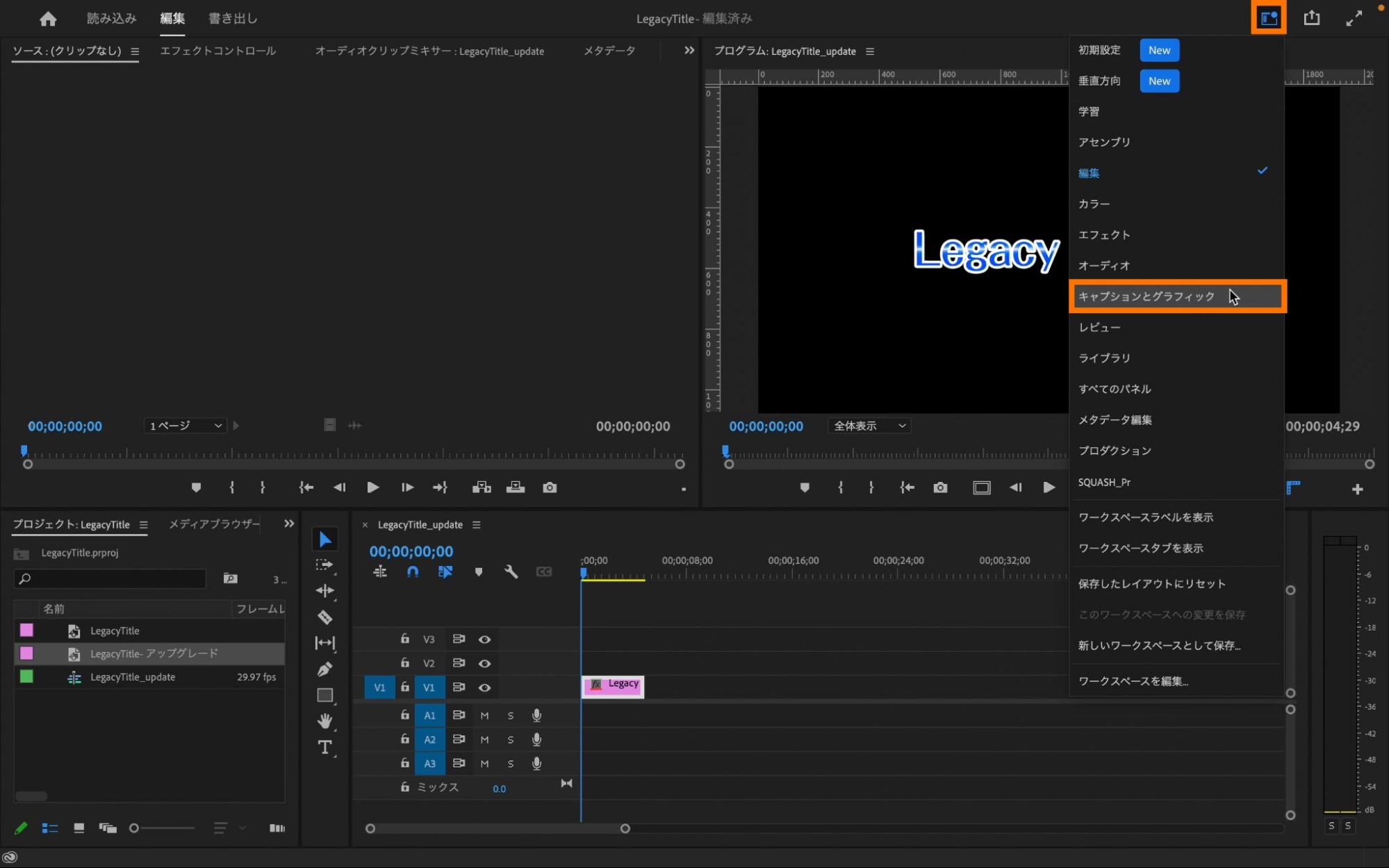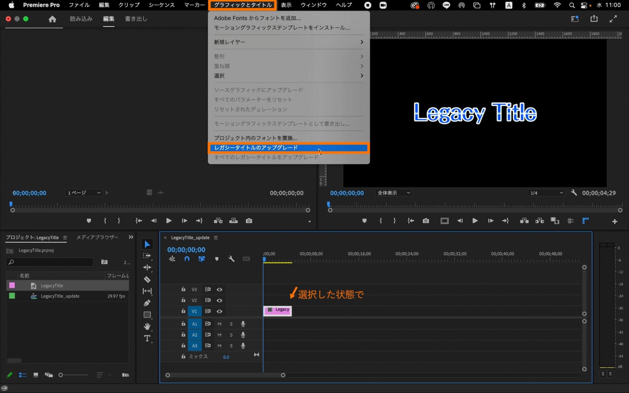 タイムラインパネル上のレガシータイトルを選択した状態で、メニューバーの「グラフィックとタイトル」から「レガシータイトルのアップグレード」を選択します。