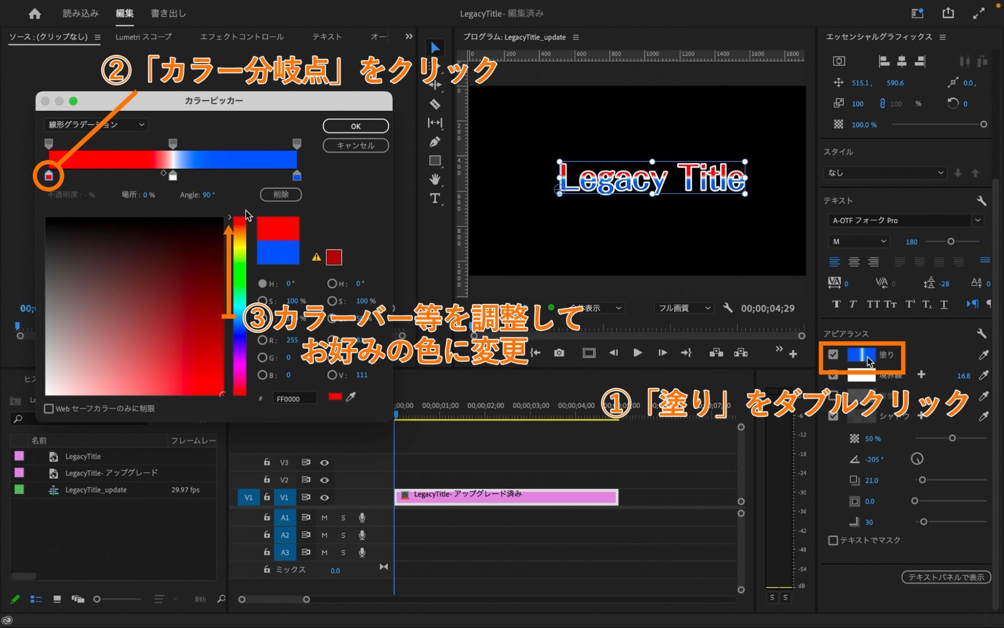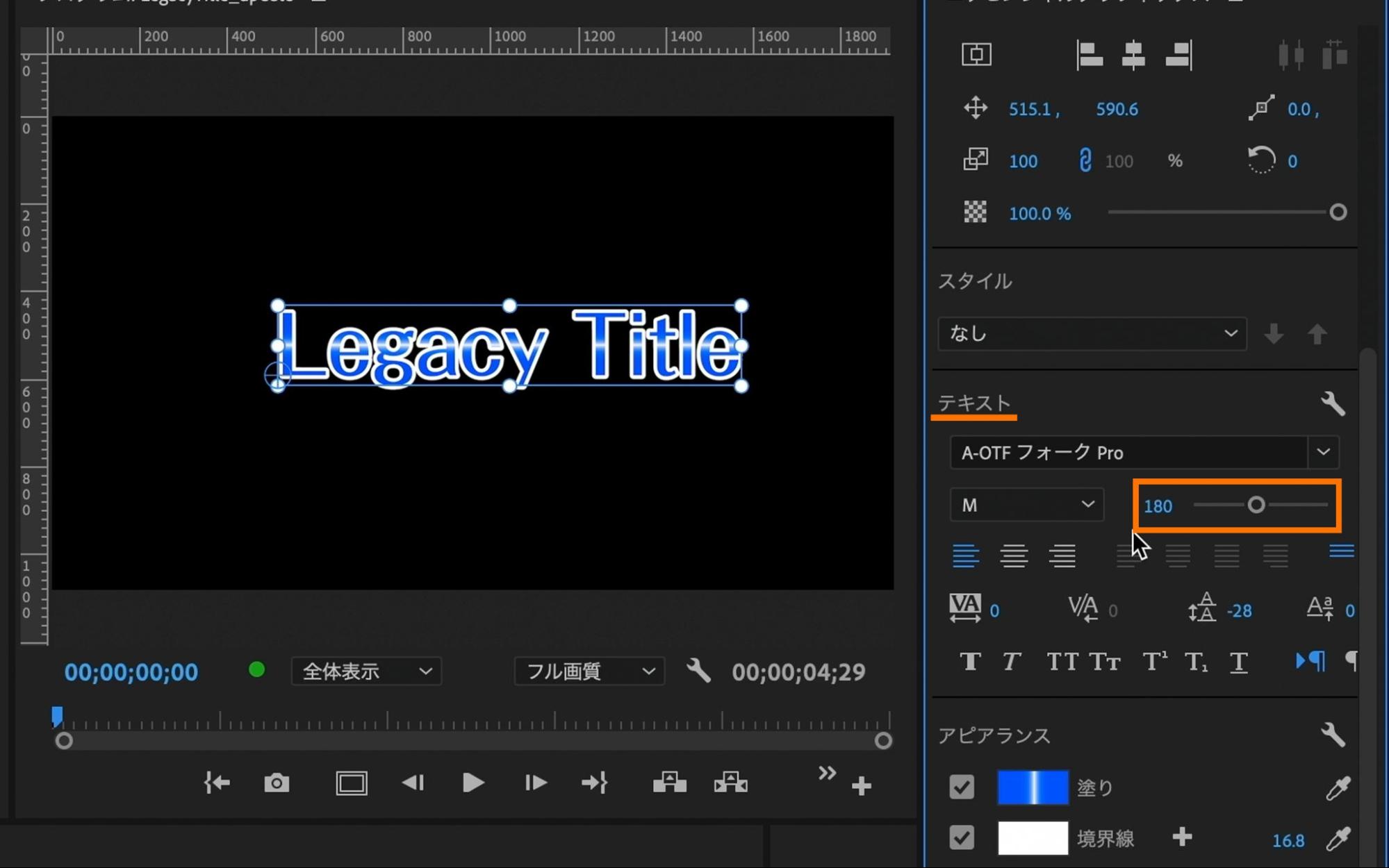 今回は「フォントサイズの変更」「塗りのグラデーション色の変更」「境界線サイズの変更」をしていきます。(※レガシータイトルで作成したテロップからデザイン変更が必要ない方は手順4へお進みください)