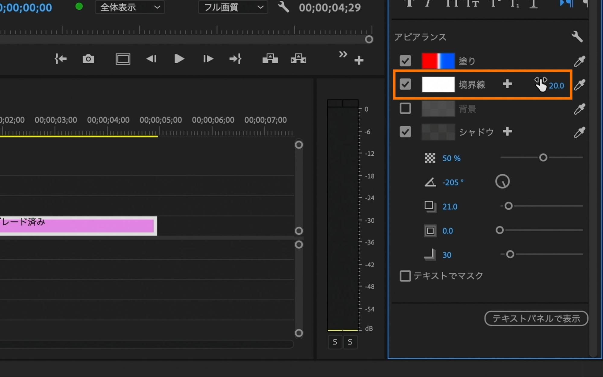 タイムラインパネル上で該当のレガシータイトルをダブルクリックすることで、これまで同様にレガシータイトルでの各種調整を行う事も可能です。