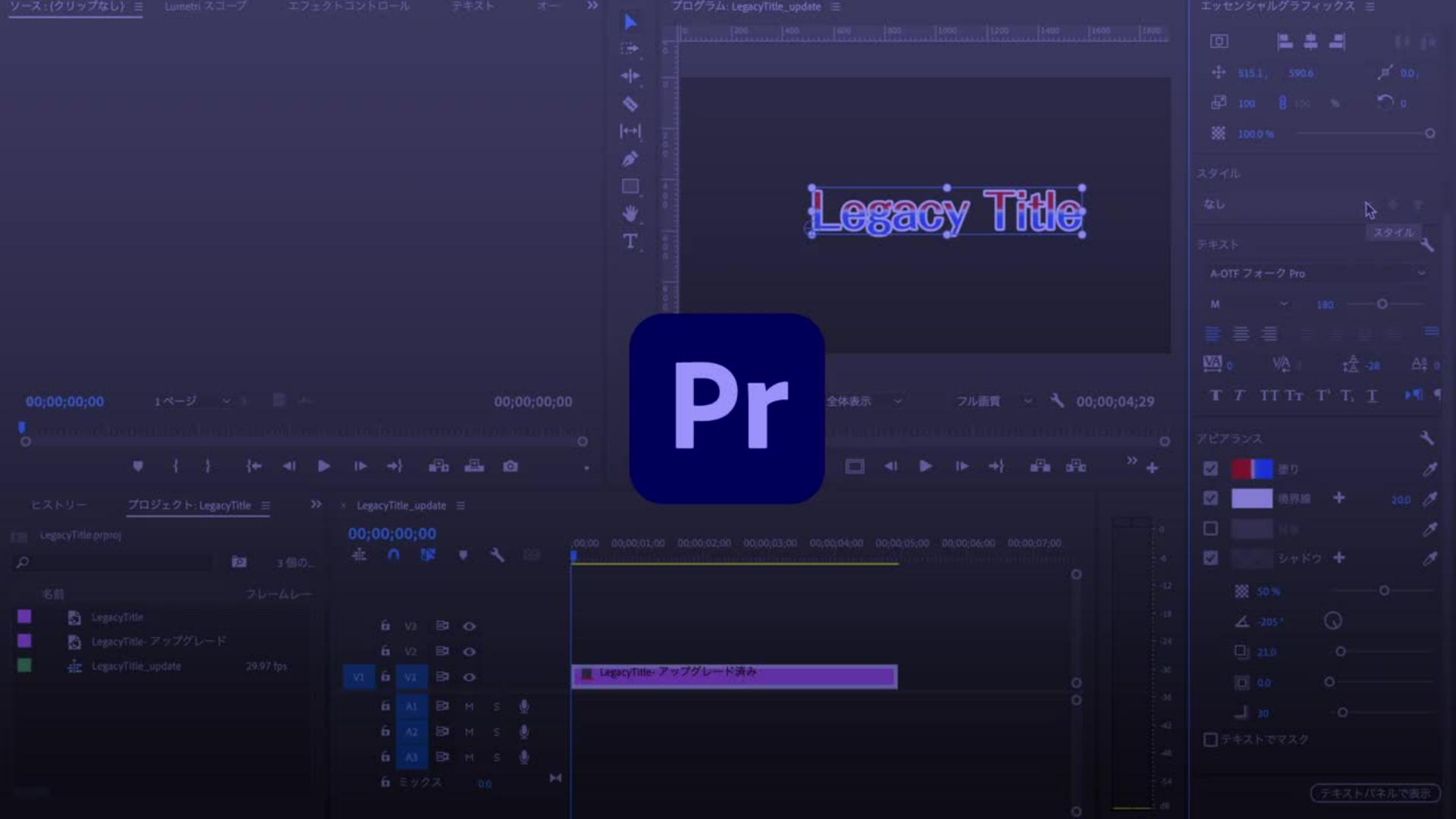 「レガシータイトルのアップグレード」を選択すると、プロジェクトパネル上にエッセンシャルグラフィックス用にアップグレードされた「LegacyTitle- アップグレード」が作成されます。