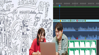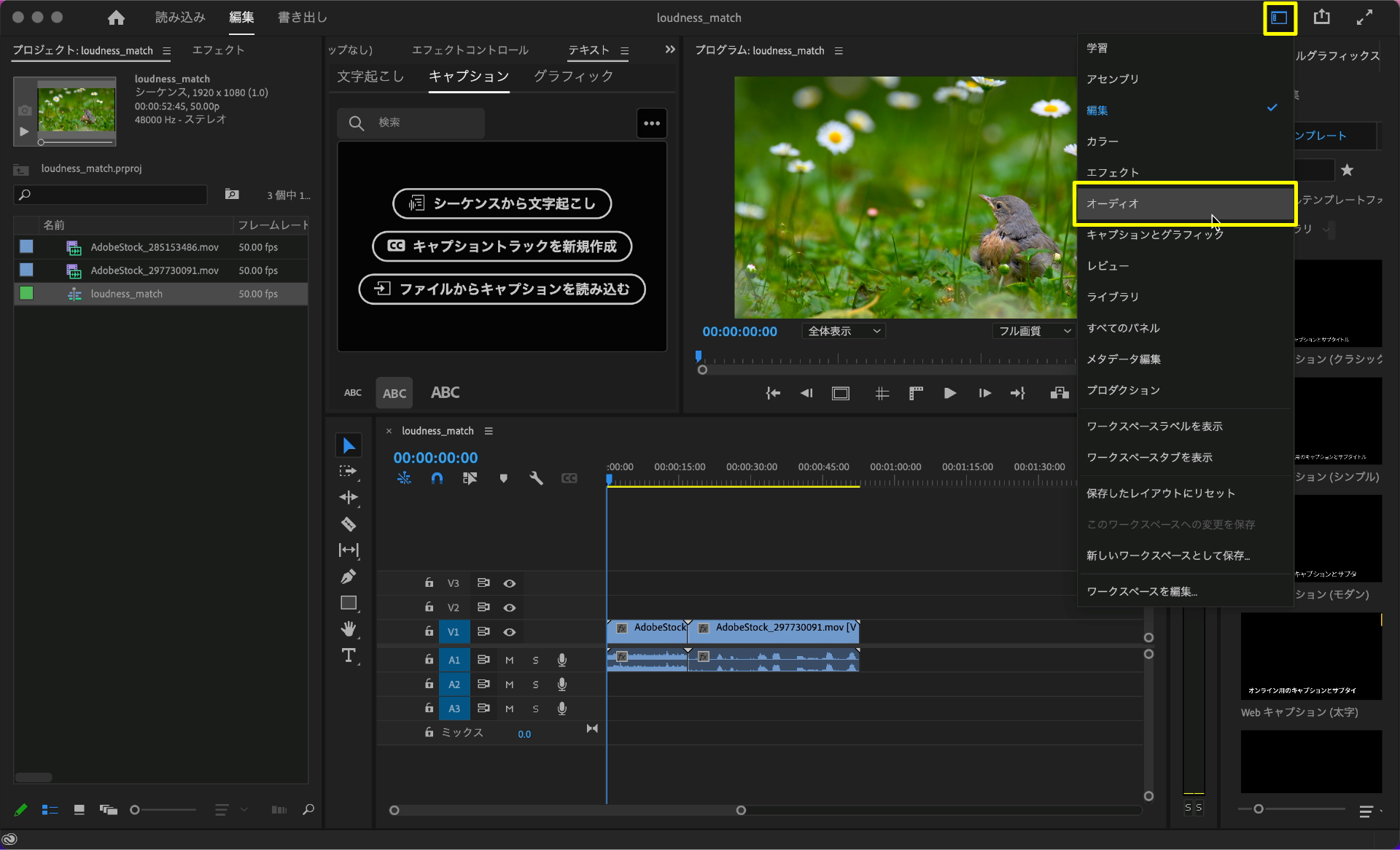 今回は音の編集なので画面右上にある「ワークスペース」を選択してワークスペースの表示を『オーディオ』に切り替えます。