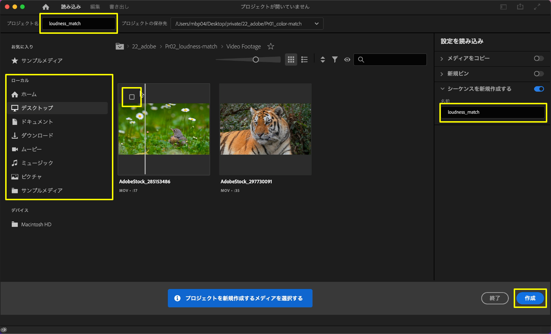 プロジェクトを新規制作する画面が表示されたら、プロジェクト名とシーケンス名を「loudness_match」に変更し、「ローカル」の欄から事前にダウンロードしたAdobeStockの素材を選んでチェックボックスにチェックを入れて右下の「作成」を選択します。