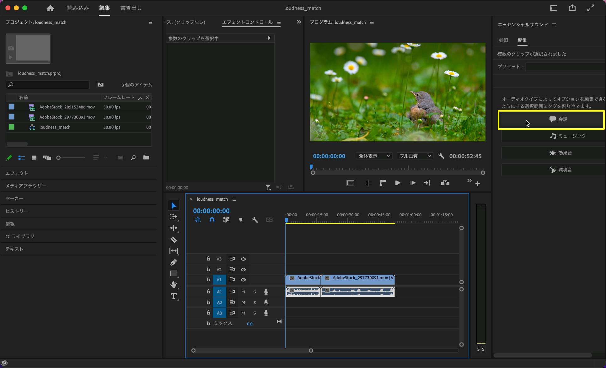 タイムラインパネル上に配置されたラウドネスを一致させたい素材を全て選択します。画面右側にある「エッセンシャルサウンド」のタブが「編集」になっていることを確認して「会話」を選択します。