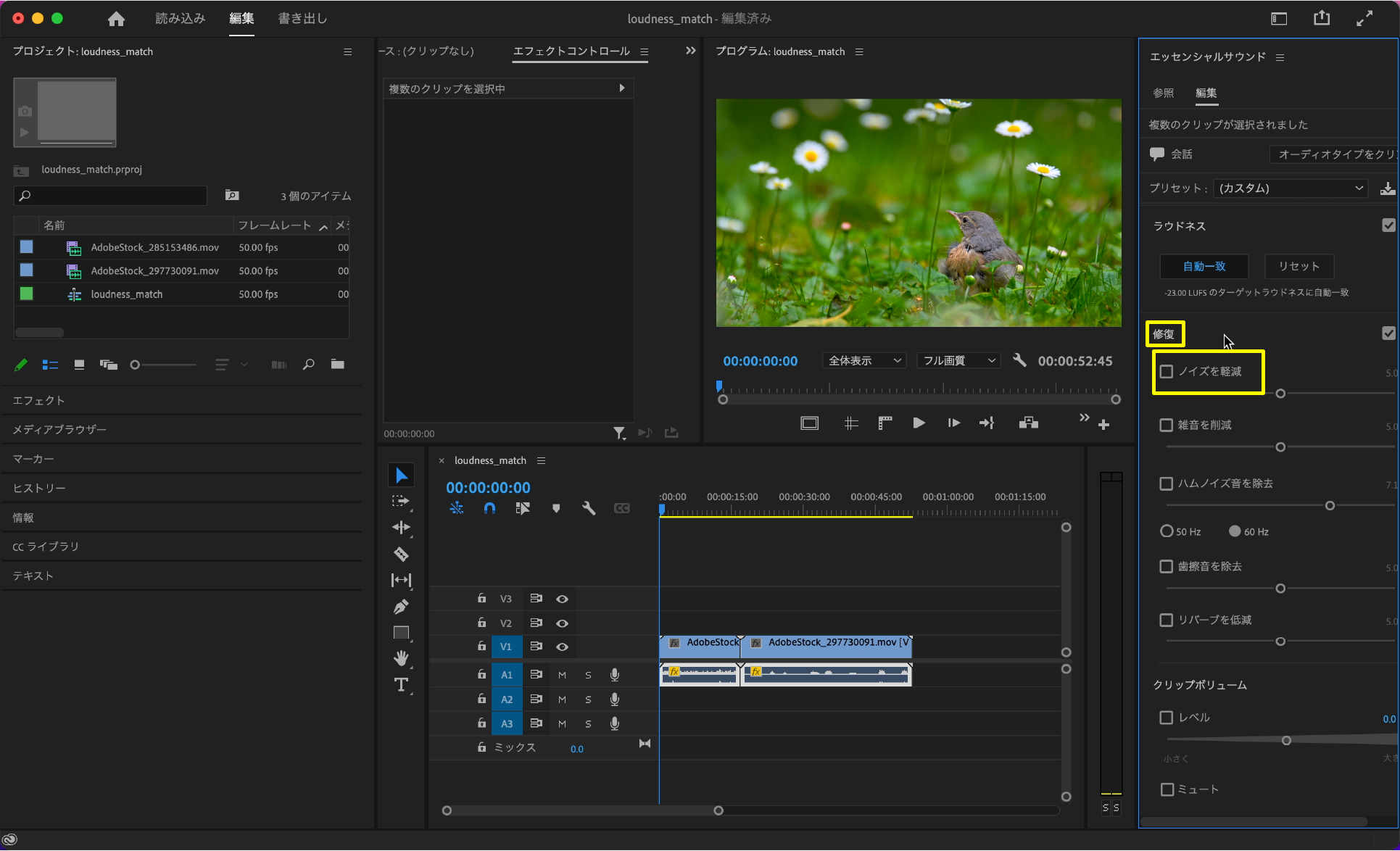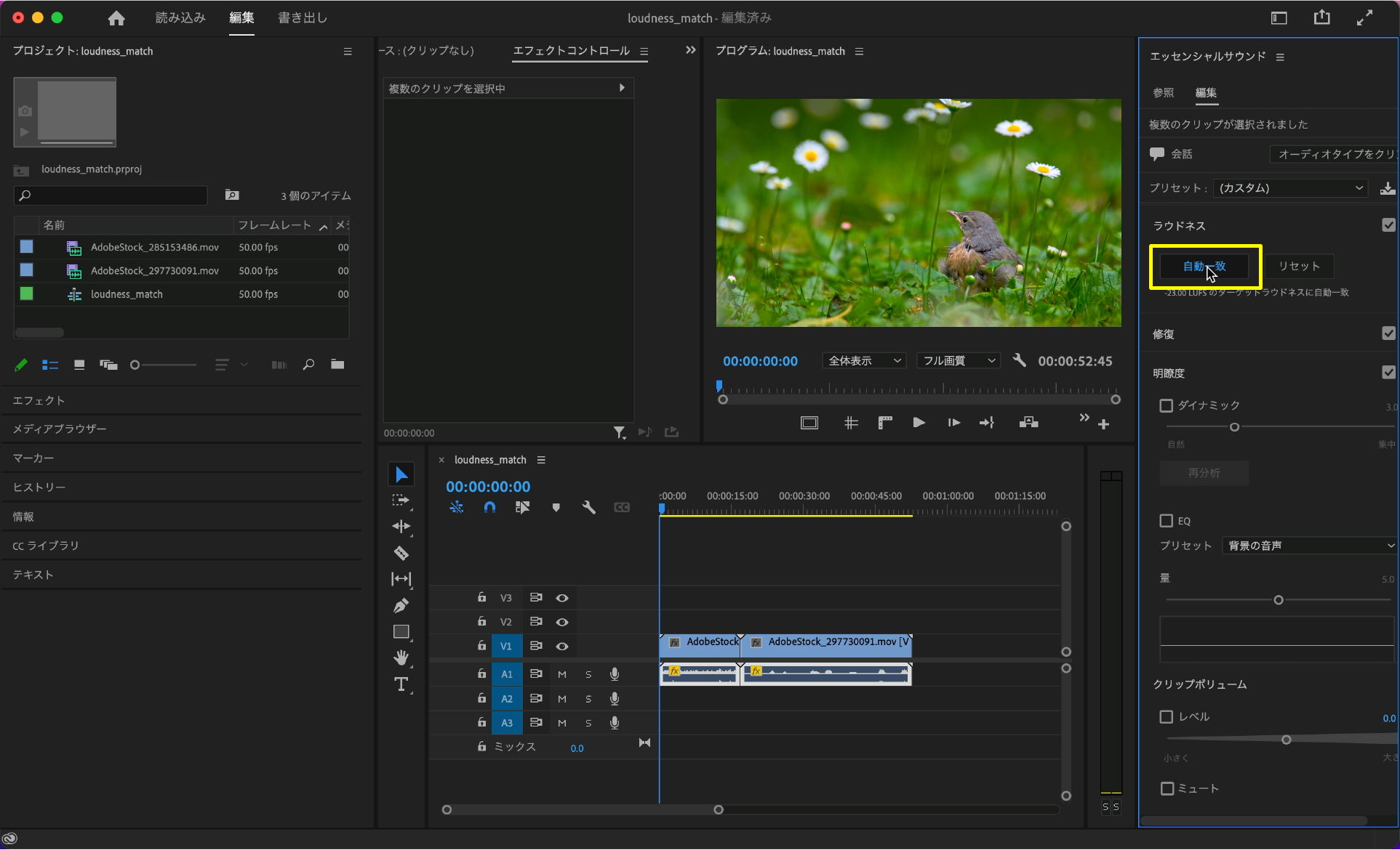素材にラウドネス一致のエフェクトを適用する