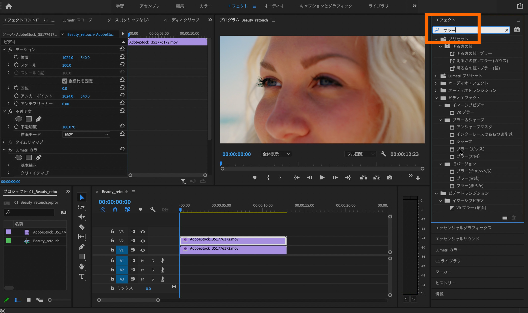 「エフェクト」パネルの検索フィールドに「ブラー」と入力します。