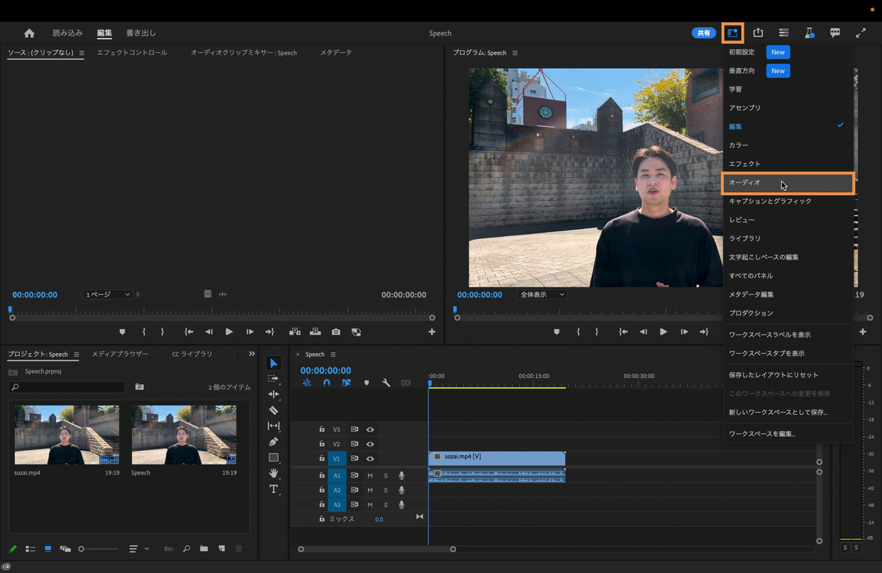 今回は音声の編集なので、画面右上にある「ワークスペース」を選択してワークスペースの表示を「オーディオ」に切り替えます。