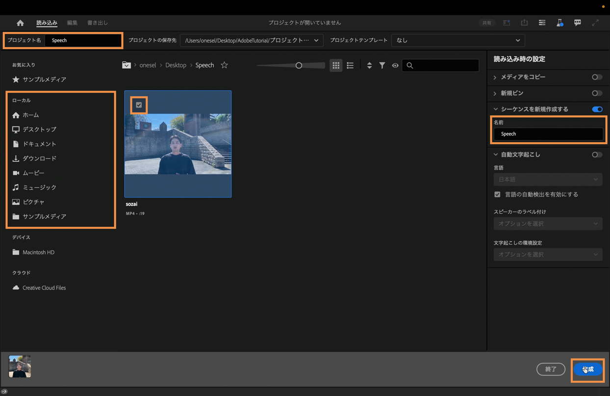 プロジェクトの新規作成画面が表示されたら、プロジェクト名とシーケンス名を「Speech」に変更し、「ローカル」の欄から事前にダウンロードした素材を選んでチェックボックスにチェックを入れて右下の「作成」を選択します。