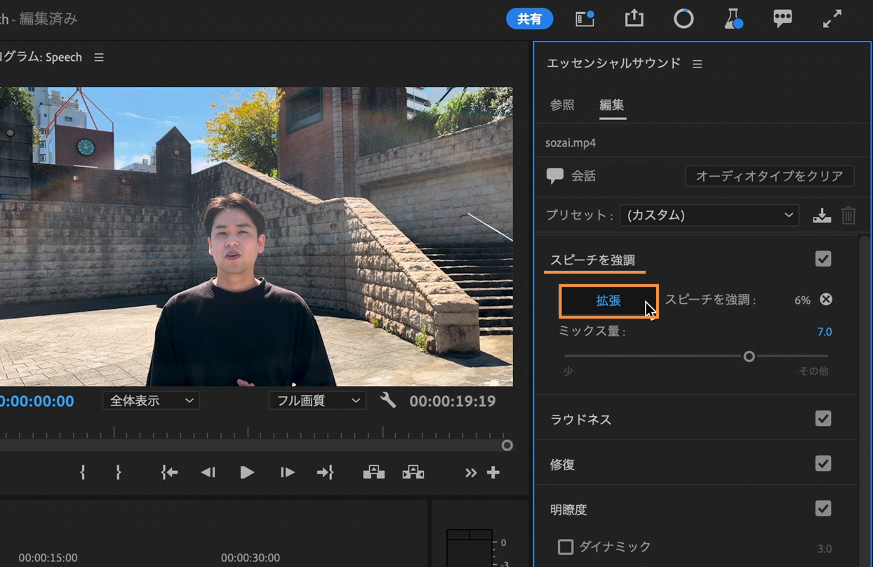 エッセンシャルサウンドパネルの中にある「スピーチを強調」にある「拡張」を選択して分析を開始します。エッセンシャルサウンドパネルに進行状況バーが表示され、選択したオーディオクリップの強調にかかる推定時間が表示されます。このタスクはバックグラウンドで実行されるので、スピーチを強調している間も編集ワークフローを続行できます。