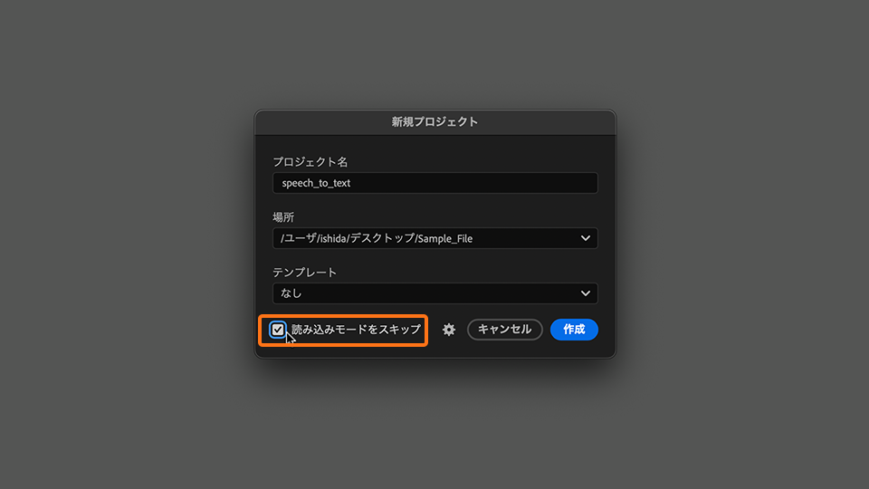 Premiere Proを起動し、「新規プロジェクト」を作成します。今回は 読み込みモードをスキップ して「 作成 」ボタンを選択します。