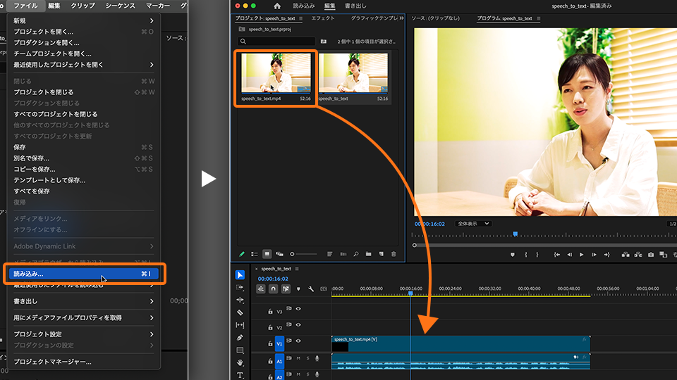 ワークスペースが開いたら、 ファイル / 読み込み から練習⽤サンプルファイル「speech_to_text.mp4」を選択して読み込みます。
