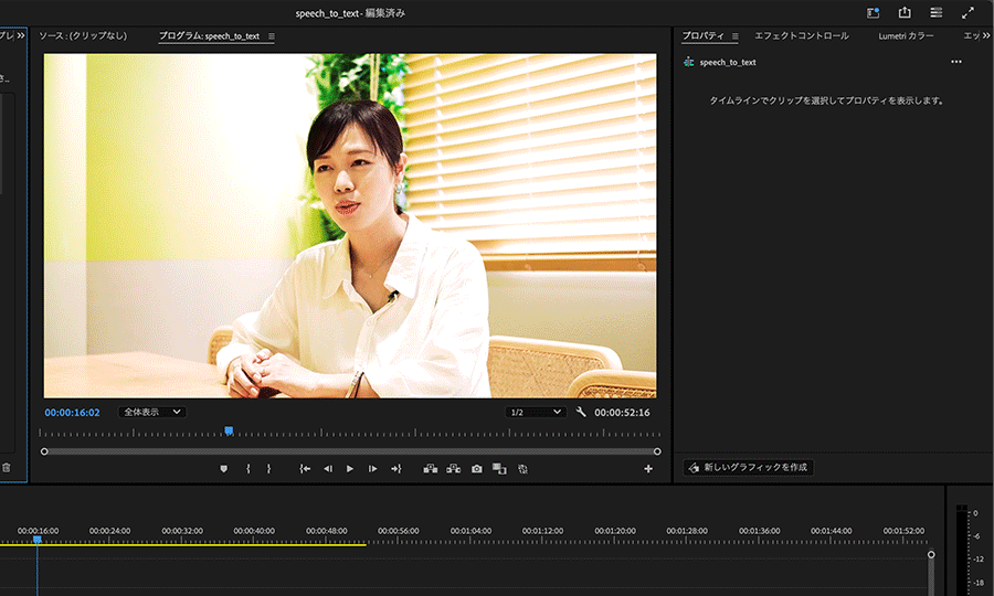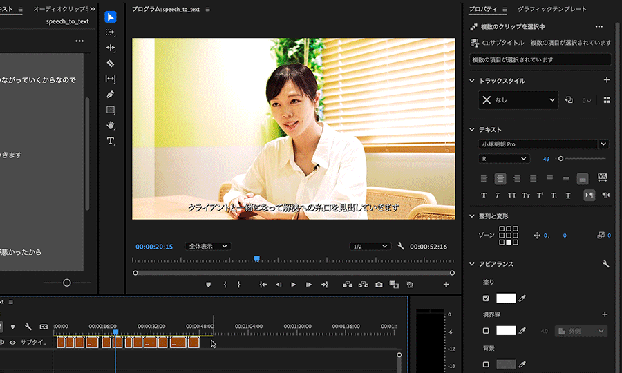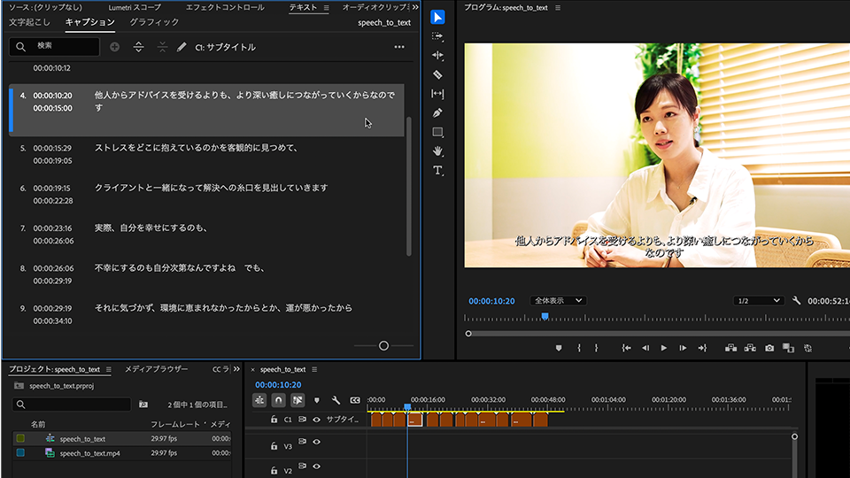 ⾳声データからの⽂字起こし、およびキャプションの作成は⾮常に時間と⼿間がかかるものです。今回の「⾳声テキスト変換」機能を使⽤すれば、⽂字起こしからキャプション作成までをPremiere Pro内でほぼ⾃動的に⾏えるため、作業時間を⼤幅に短縮することができます。ぜひ試してみてください。