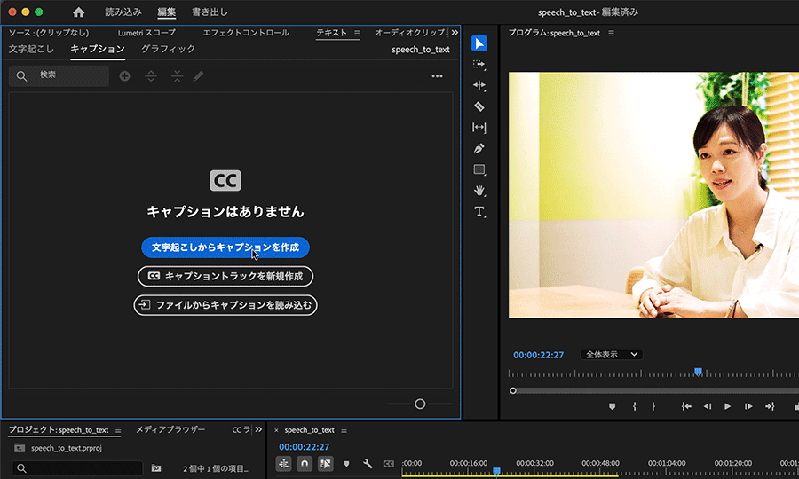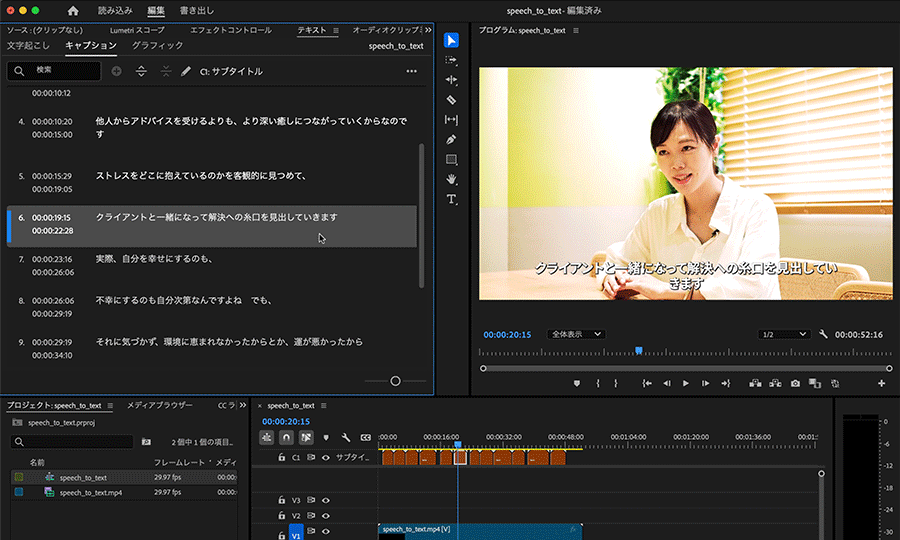 ⽂字起こしが⾃動的に開始され、処理が終わると、 テキスト パネルの「 キャプション 」タブに結果が表⽰されます。すべてのキャプションがタイムコード付きで表⽰されます。テキストをダブルクリックすると、⽂字の編集をおこなうことができます。