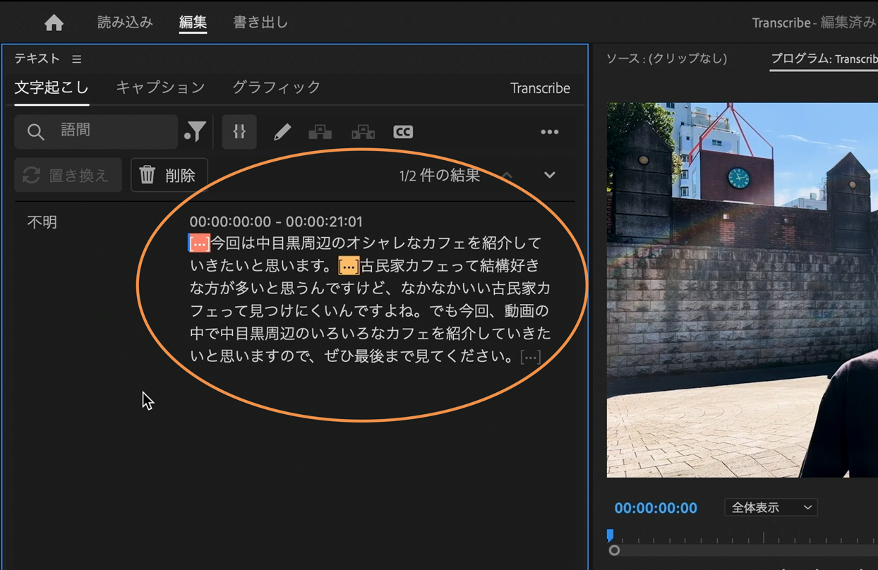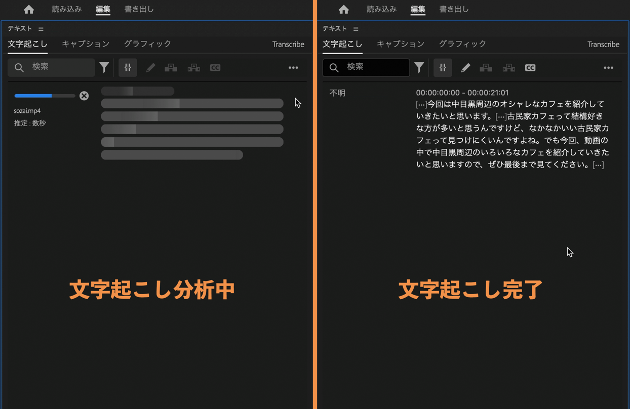 映像素材の分析が終了すると、文字起こしされたテキストが表示されます。