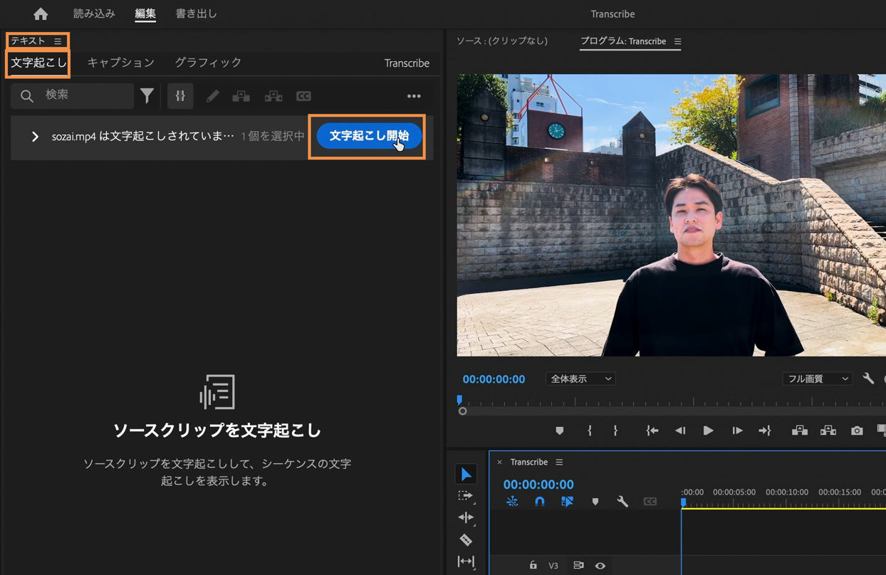 テキストパネルから「文字起こし」タブが選ばれている事を確認して、「文字起こし開始」を選択。