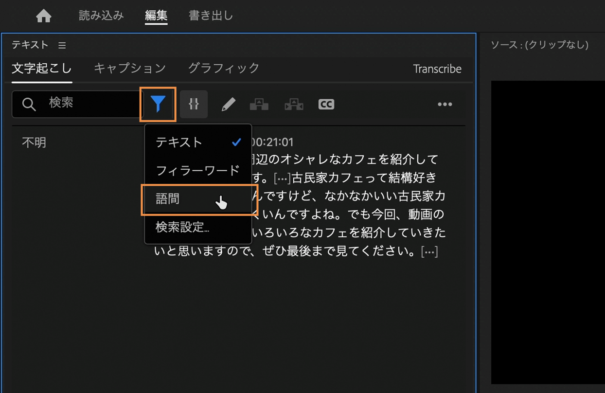 テキストパネル→「文字起こし」タブ内の検索窓の横にあるフィルターマークを左クリックし、プルダウンの中から「語間」を選択します。